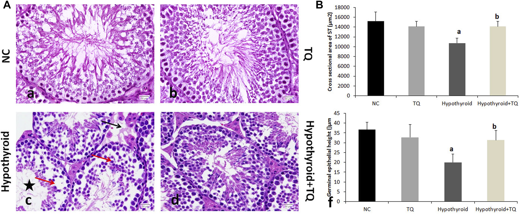 Effects of thymoquinone administration on the histological structure of the testes of hypothyroid rats (A). Control (a) and TQ-treated (b) groups show intact structure, while the hypothyroid group (c) shows smaller and irregular ST, widening of the interstitial space, and reduced number and vaculation of interstitial cells of Leydig (black arrow). The germinal epithelium showed multiple spaces and gaps between the cells, detachment, and reduced spermatocytes density (red arrow). The ST showed reduced number and scattered spermatids (star). These changes are less frequently observed in the hypothroid + TQ group (d). The graph shows the cross-sectional area of the seminiferous tubules (B) and the height of the germinal epithelium (B) of the studied groups. TQ, Thymoquinone. NC, Normal control. Data are presented as the mean ± SD. A comparison between groups was done using one-way ANOVA test followed by Bonforoni post hoc test (n = 6).