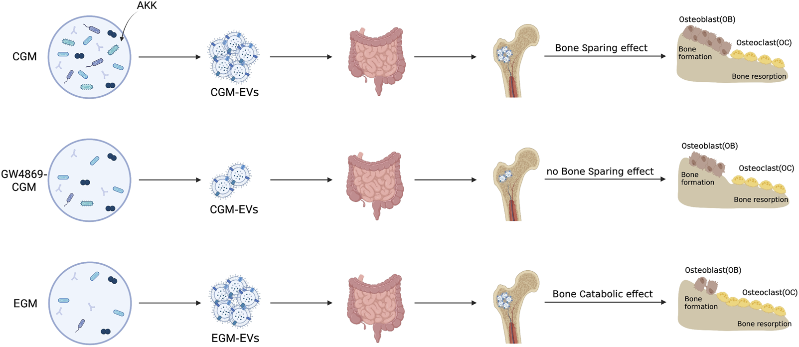 Excitingly, a novel treatment approach called Fecal Microbiota Transplantation (FMT) delays the progression of degenerative and chronic disorders (Hanssen et al., 2021). According to Xie et al., replacing aged GM (EGM) with young GM (CGM) prevented the loss of bone strength and bone mass in ovariectomy (OVX)-induced OP mice (Liu et al., 2021b). Transplanting CGM dramatically enhanced the amount of AKK in OP mice, according to 16S rRNA sequencing. Additionally, AKK given directly to OVX-induced mice dramatically increased OP. Further investigation revealed that administration of GW4869, a neutral sphingomyelinase inhibitor, interferes with the secretion of BEVs, and the anti-osteoporotic effects of AKK were dramatically reduced.