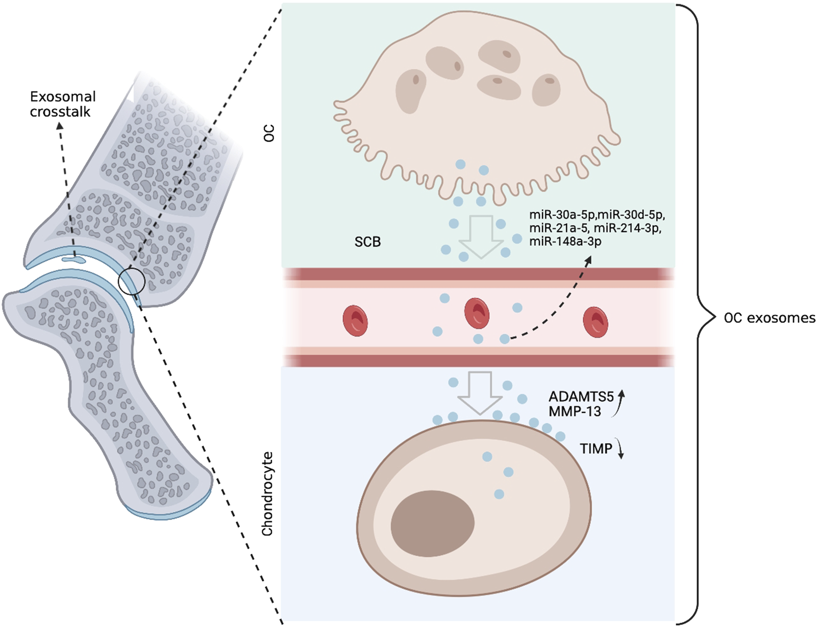 Anterior cruciate ligament transection (ACLT) was performed on mice to create the OA phenotype. Combined with in vitro culture models, small extracellular vesicles rich in coding miRNAs are secreted by OCs. These miRNAs are translocated to chondrocytes, where they suppress genes like TIMP that alleviate matrix deterioration, increasing the activities of ADAMTS5 and MMP-13. The concentration of OC miRNAs in circulating exosomes increases, and they appear to leave the SCB and re-enter the chondrocytes.