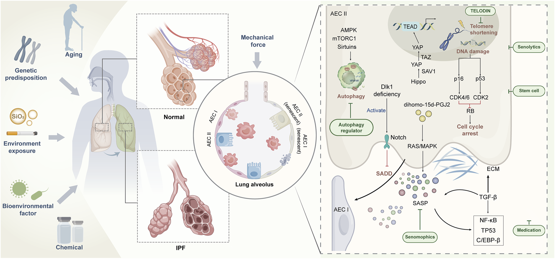 Regulation of AECII senescence and strategy of targeting senescent AECⅡ for IPF treatment.