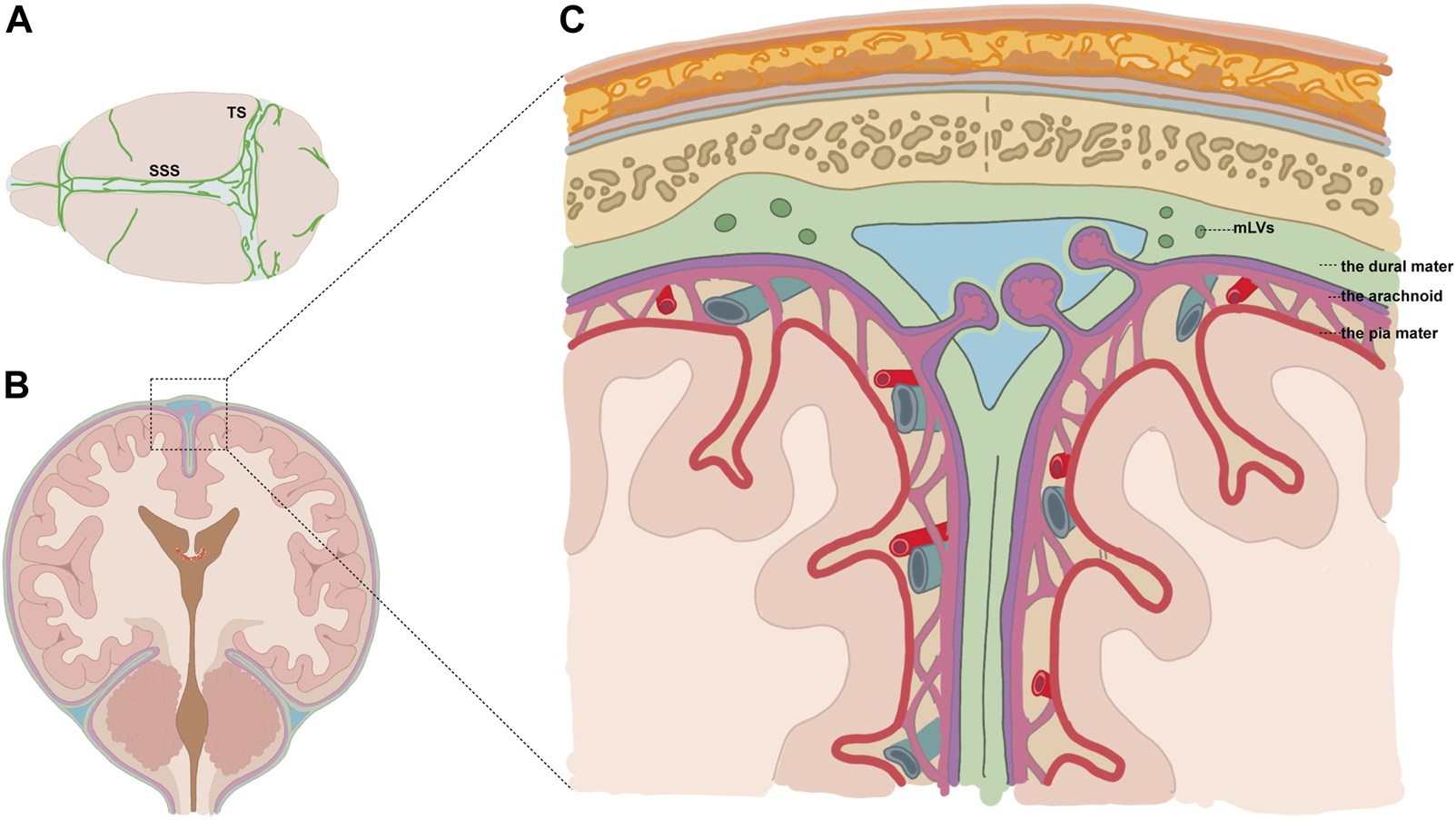 Diagram showing the location of mLVs. (A) Meningeal lymphatic vessels (mLVs) located around the superior sagittal sinus (SSS), transverse sinus (TS), etc.(B,C) Vessels were located within dural folds (green) and were adjacent to the subarachnoid space.