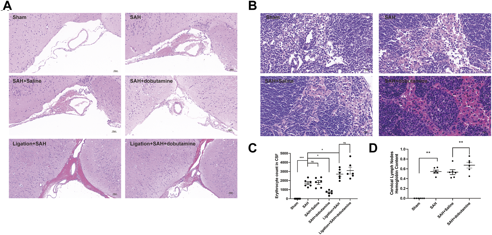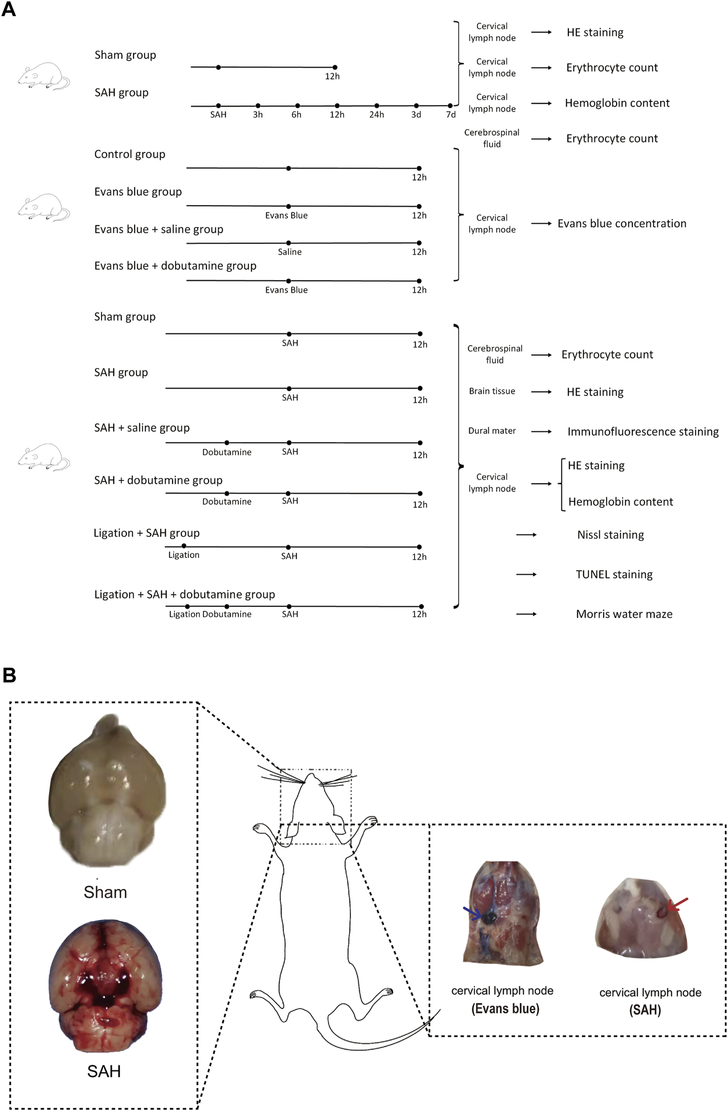 Materials and methods: Experimental SAH was induced by injecting autologous arterial blood into the prechiasmatic cistern in male C57BL/6 mice. Evans blue was injected into the cisterna magna, and dobutamine was administered by inserting a femoral venous catheter. RBCs in the deep cervical lymphatic nodes (dCLNs) were evaluated by hematoxylin–eosin staining, and the hemoglobin content in dCLNs was detected by Drabkin’s reagent. The accumulation of RBCs in the dura mater was examined by immunofluorescence staining, neuronal death was evaluated by Nissl staining, and apoptotic cell death was evaluated by TUNEL staining. The Morris water maze test was used to examine the cognitive function of mice after SAH.