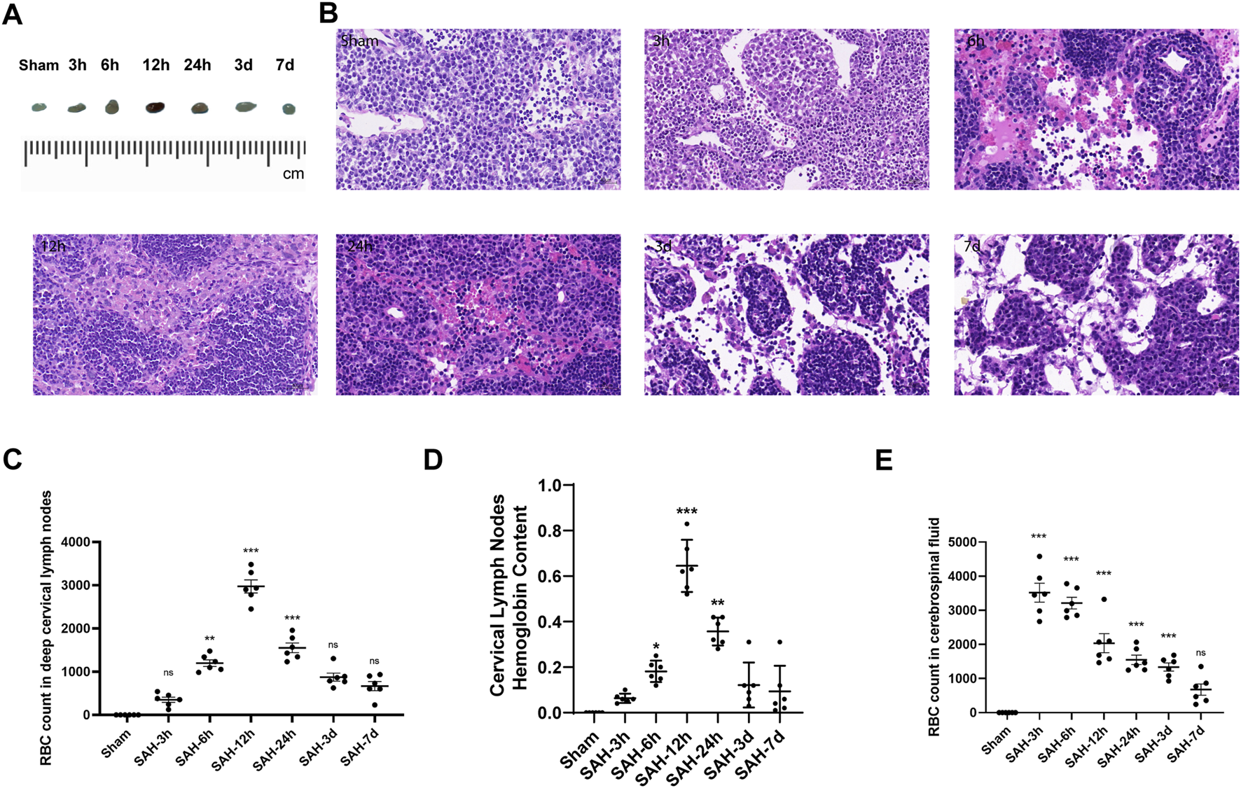 Time-course accumulation of RBCs in dCLNs after SAH. (A) Gross appearance of dCLNs after SAH at different times. (B) HE staining of dCLNs after SAH at different times. The erythrocyte accumulation in dCLNs obviously increased 12 h after SAH. (C) Quantitative analysis of the RBC count in deep cervical lymph nodes at different times (n = 6 mice, **p < 0.01, and ***p < 0.001). (D) Hemoglobin content analysis of dCLNs after SAH at different times. Data are presented as the mean ± SD (n = 6 mice, *p < 0.05, **p < 0.01, and ***p < 0.001). (E) Quantitative analysis of the RBC count in cerebrospinal fluid at different times (n = 6 mice and ***p < 0.001).