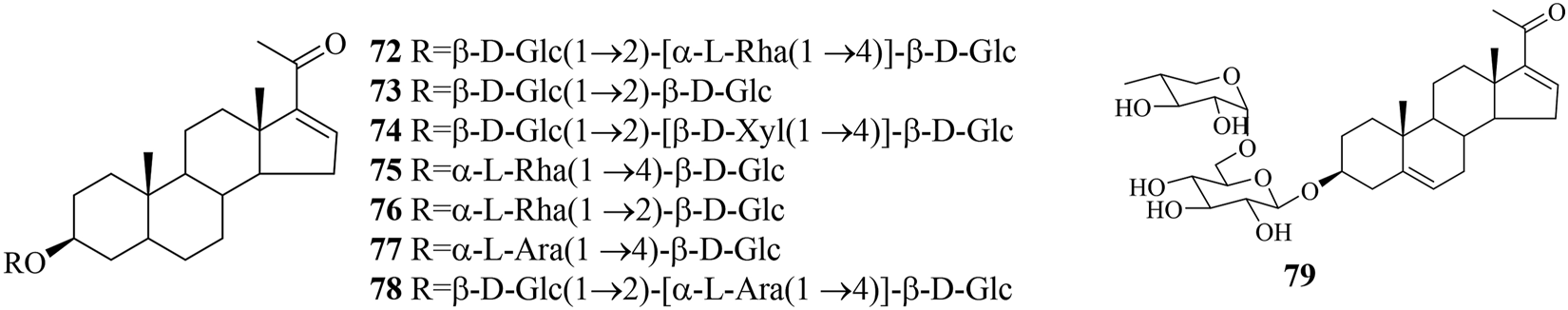 | 77 | (3β,5β)-pregn-16(17)-en-3-ol-20-one 3-O-α-L-arabinopyranosyl-(1→4)-β-D-glucopyranoside | 70% MeOH | C20H50O11 | 466.6040 | Zhu et al. (2021) |