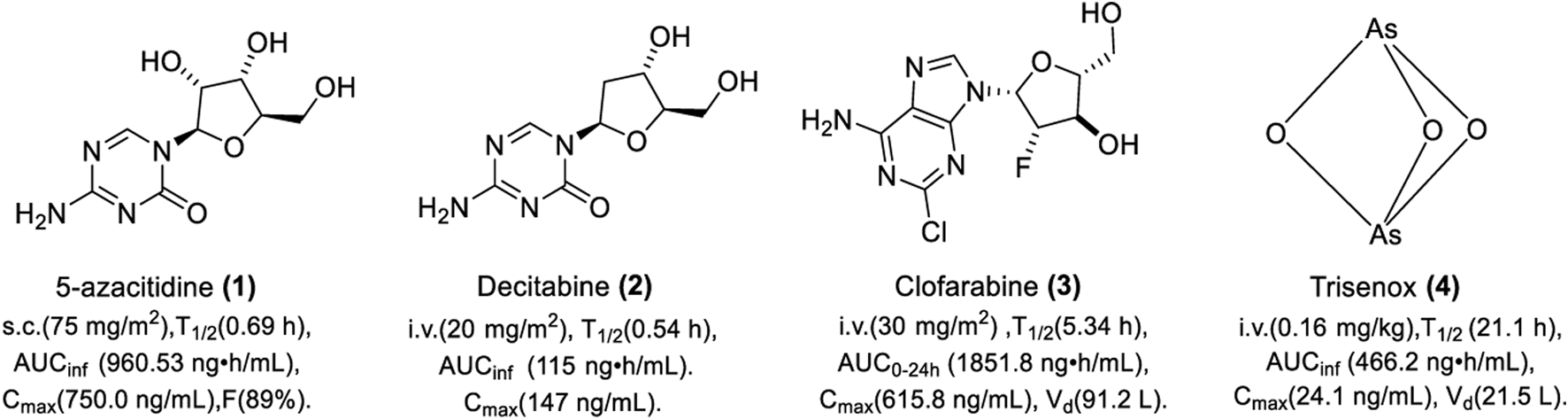 Currently, there are nearly 70 DNMTi pipelines under development worldwide. In total, 16 pipelines have already been in the clinical research stage and some of them have already entered the phase III clinical study (Table 1). Azacitidine, decitabine, clofarabine, and arsenic trioxide have been approved for the treatment of myelodysplastic syndrome (MDS) and hematological cancer.