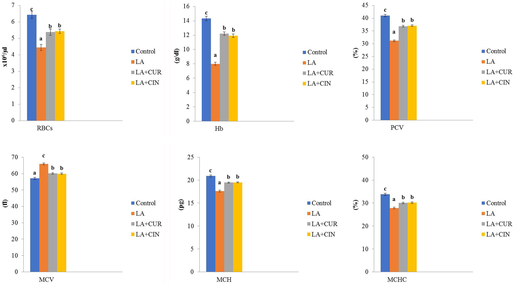 In regard to the hemogram, there were significant reductions in RBC count, Hb concentration, and hematocrit percentage in the LA-treated group compared to the control group. Meanwhile, those parameters revealed significant elevations in the LA + CUR and LA + CIN groups compared to the LA-treated group. Concerning red blood cell indices, MCV showed a significant increase with significant decreases in MCH and MCHC in the LA-treated group compared to the control one. However, the LA + CUR and LA + CIN groups exhibited a significant decrease in MCV along with significant increases in MCH and MCHC compared to the LA-treated group (Figure 1).