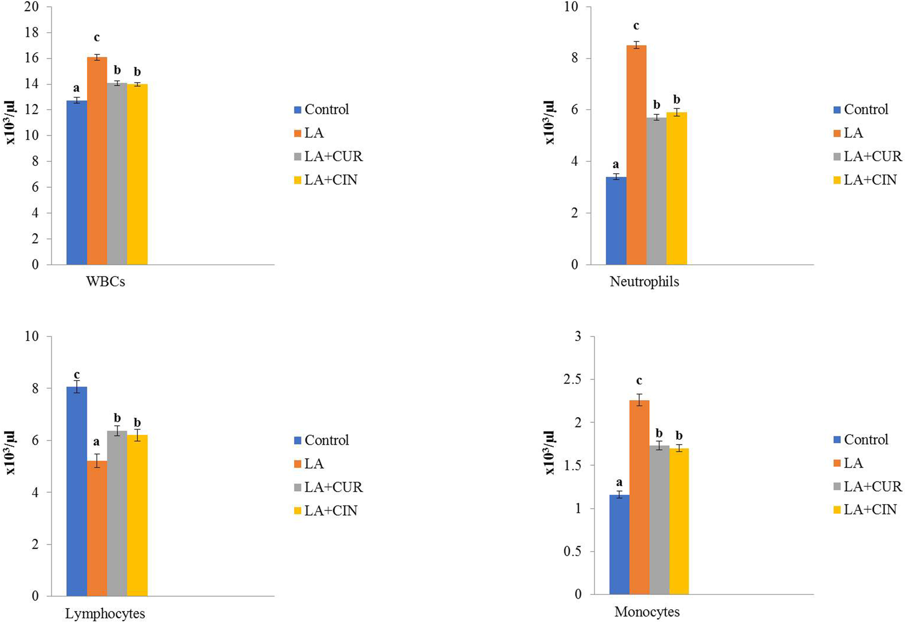 As shown in Figure 2, leukogram results revealed significant elevations in WBC, neutrophil, and monocyte counts and a significant reduction in lymphocyte count in the LA-treated group compared to the control group. In contrast, the LA + CUR and LA + CIN groups showed significant decreases in WBC, neutrophil, and monocyte counts with a significant increase in lymphocyte count compared to the LA-treated group.
