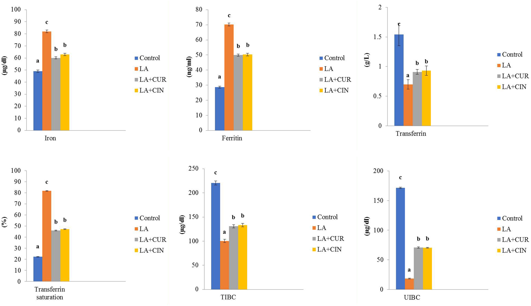 Significant elevations in serum iron and ferritin levels, as well as transferrin saturation percentage, along with significant decreases in TIBC, UIBC, and transferrin levels were recorded in the LA-treated group compared to the control group. On the other hand, the LA + CUR and LA + CIN groups revealed an observable decline in serum iron, ferritin, and transferrin saturation percentage besides significant elevations in TIBC, UIBC, and transferrin levels compared to the LA-treated group (Figure 3). It was concluded that LA caused a disturbance in iron parameters which returned toward normal in the CIN- and CUR-treated groups.