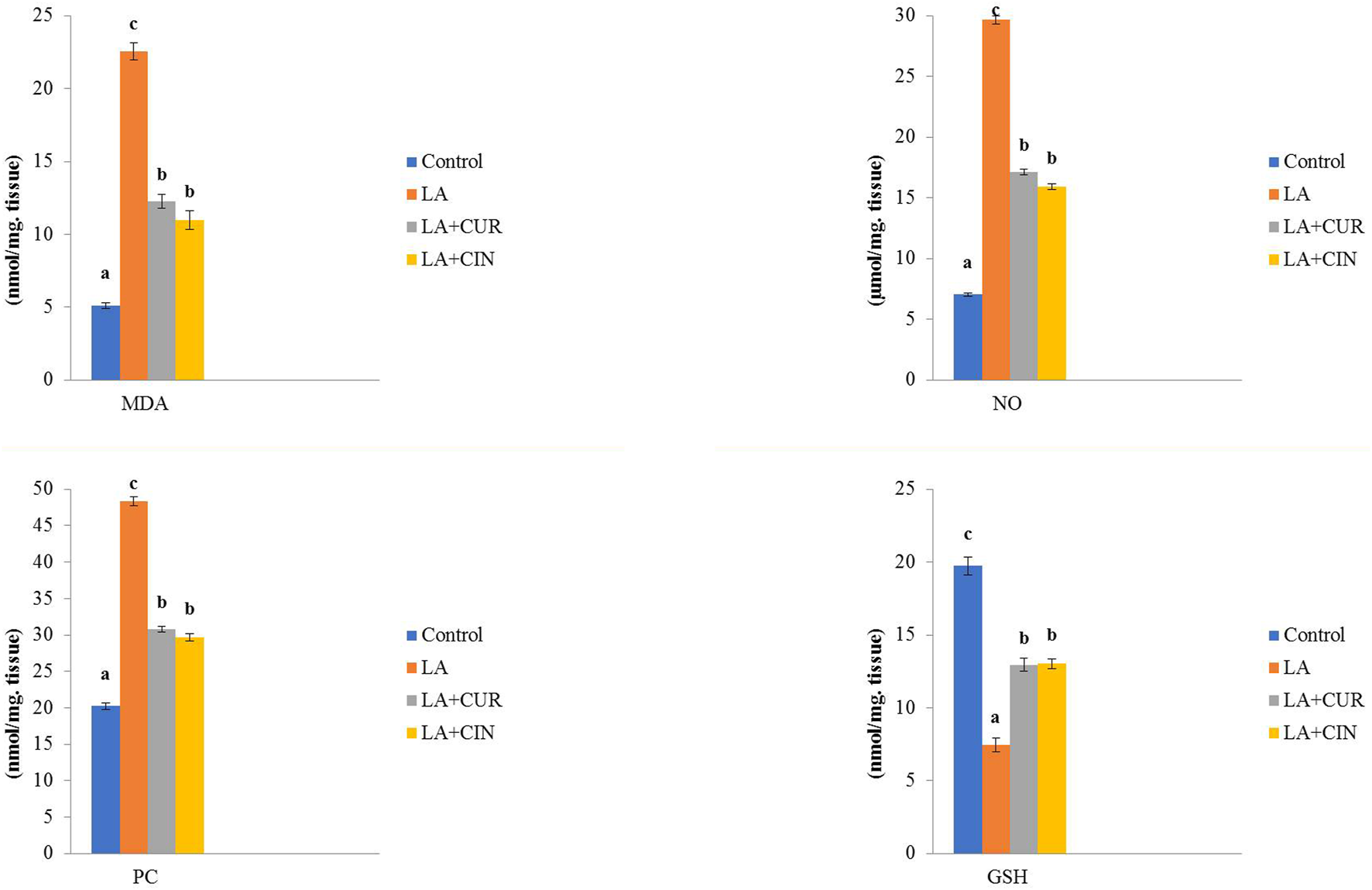 Rats exposed to LA showed significant increases in MDA, NO, and PC, along with a significant reduction in GSH activity compared to the control group. Meanwhile, the LA + CUR and LA + CIN groups exhibited significant declines in MDA, NO, and PC levels as well as a significant elevation in GSH activity compared to the LA-treated group (Figure 5). LA induces oxidative stress and depletion of antioxidants within splenic tissue, but CIN and CUR ameliorated these effects.