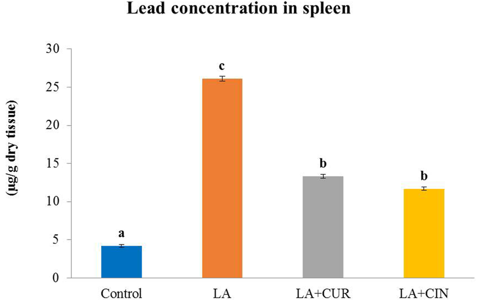 Splenic tissues from the LA-treated group exhibited a significantly high lead content compared to those from the control group. Meanwhile, groups supplemented with CUR and CIN revealed significantly lower splenic content of lead (Figure 6) compared to the LA-treated group.