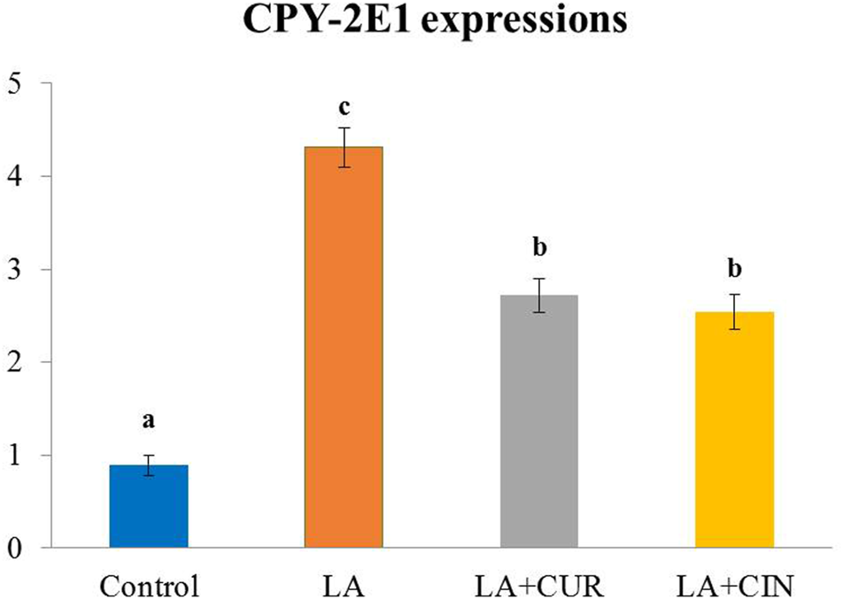 The splenic expression of CYP-2E1 was upregulated in the LA-treated group compared with the control group. On the contrary, the CUR- and CIN-treated groups revealed significant decreases in the expression of CYP-2E1 compared with the LA-treated group (Figure 7).