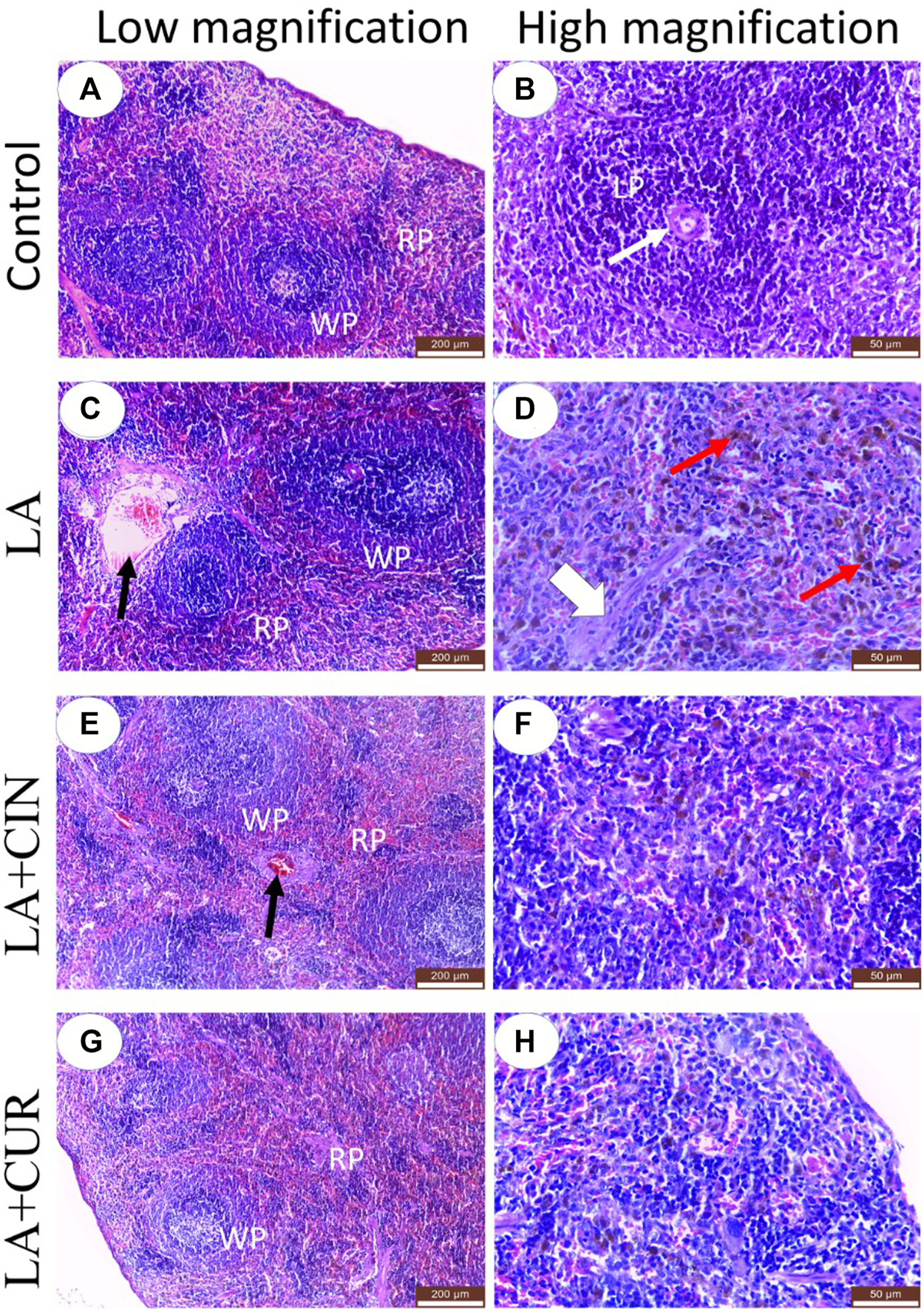 H&E-stained sections of the spleen from adult Albino rats, (A) control, (C) LA, (E) LA + CIN, and (G) LA + CUR groups. (B), (D), (F), and (H) were higher magnification of control, LA, LA + CIN, and (G) LA + CUR groups, respectively. Red pulp (RP), white pulp (WP), lymphoid follicle (LP), central arteriole (thin white arrows), blood vessels (black arrows), septa (broad white arrow), and hemosiderin pigments (red arrows). H&E stain.