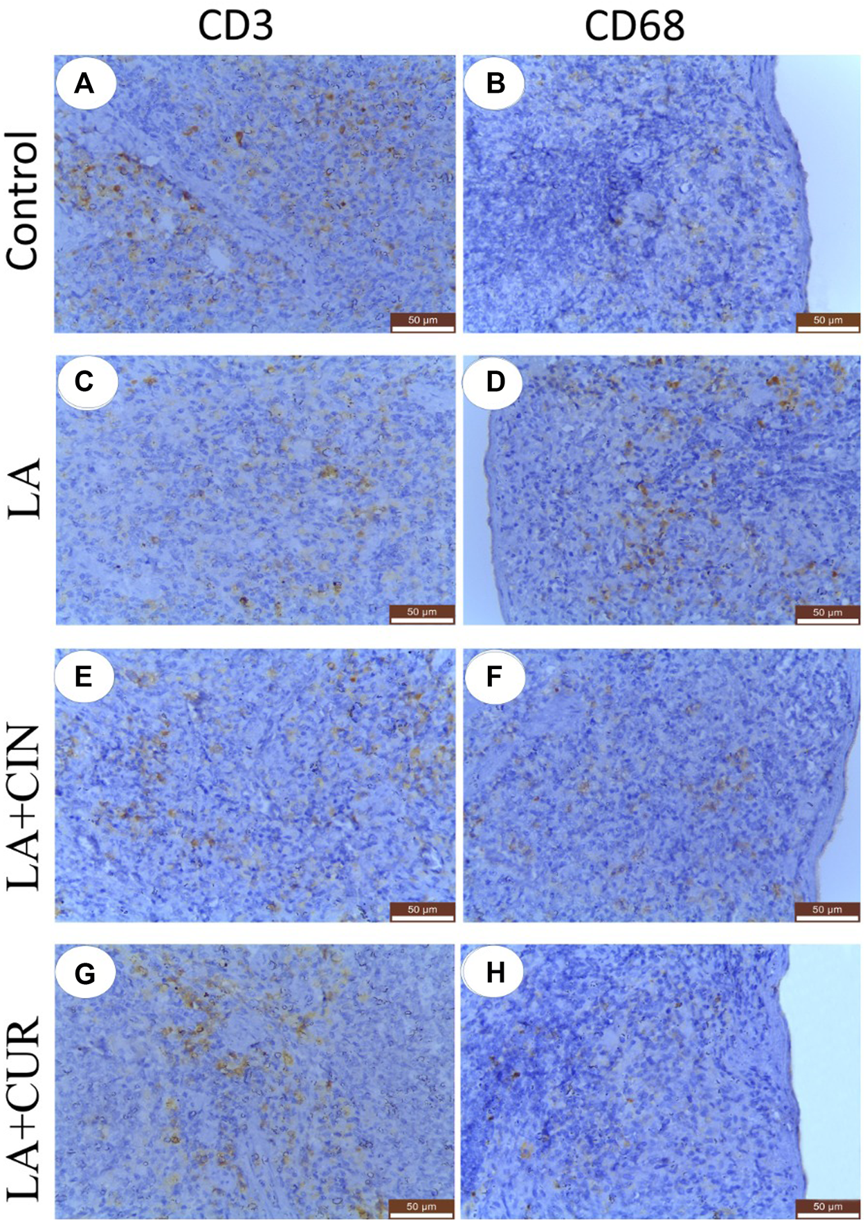 Both the LA + CIN- and LA + CUR-treated groups revealed a significant improvement of splenic tissue architectures with partially normal white and red pulps compared to the LA group (Figures 8E,G), where prominent red pulps were detected, indicating a reduction of the hyperplastic lymphoid reaction (Figures 8E,G). In comparison to the LA group, the splenic blood vessels showed significantly slight congestion in the CIN + LA group (Figure 8E), and no congestion in the LA + CUR group (Figure 8G) along with significantly slight dilatation of sinusoids with scanty hemosiderin pigment deposition were noticed (Figures 8F,H). A summary of the scoring of histological alteration in splenic tissues among different groups is recorded in Table 2.