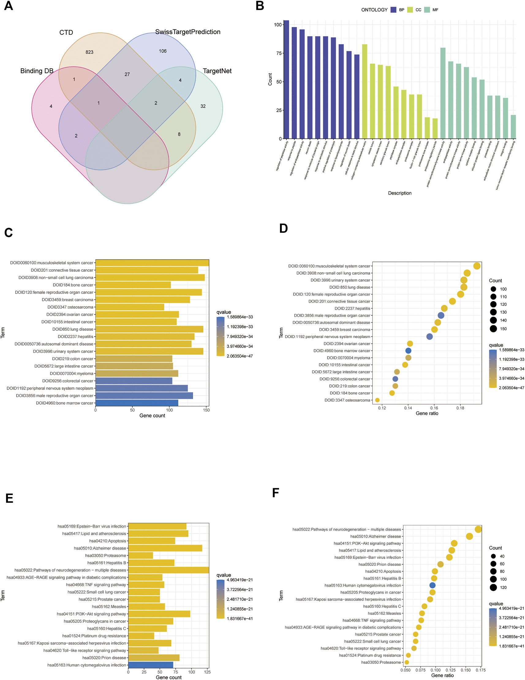 Screening analysis of paclitaxel targets. (A) Venn diagram of paclitaxel in the four databases. (B) Gene Ontology (GO) enrichment analysis of paclitaxel targets. (C,D) DO enrichment analysis of paclitaxel targets. (E,F) Kyoto Encyclopedia of Genes and Genomes (KEGG) enrichment analysis of paclitaxel targets.