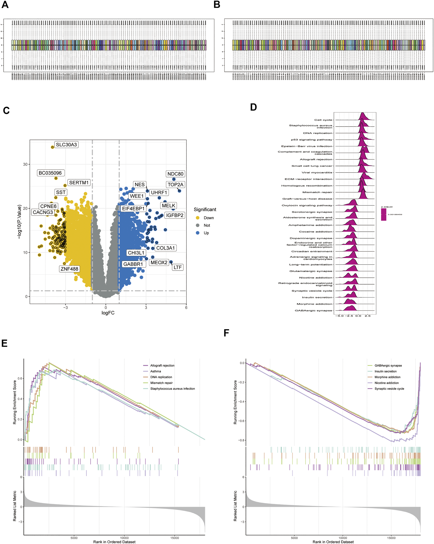 Expression of differentially expressed genes (DEGs) in the GSE4290 dataset. (A,B) Datasets were compared before and after normalization. (C) Volcano plot of DEGs in the GSE4290 dataset. (D) Ridge plots with normalized enrichment scores show the pathways where DEGs are most enriched in gene set enrichment analysis (GSEA). (E,F) GSEA analysis based on KEGG analysis.