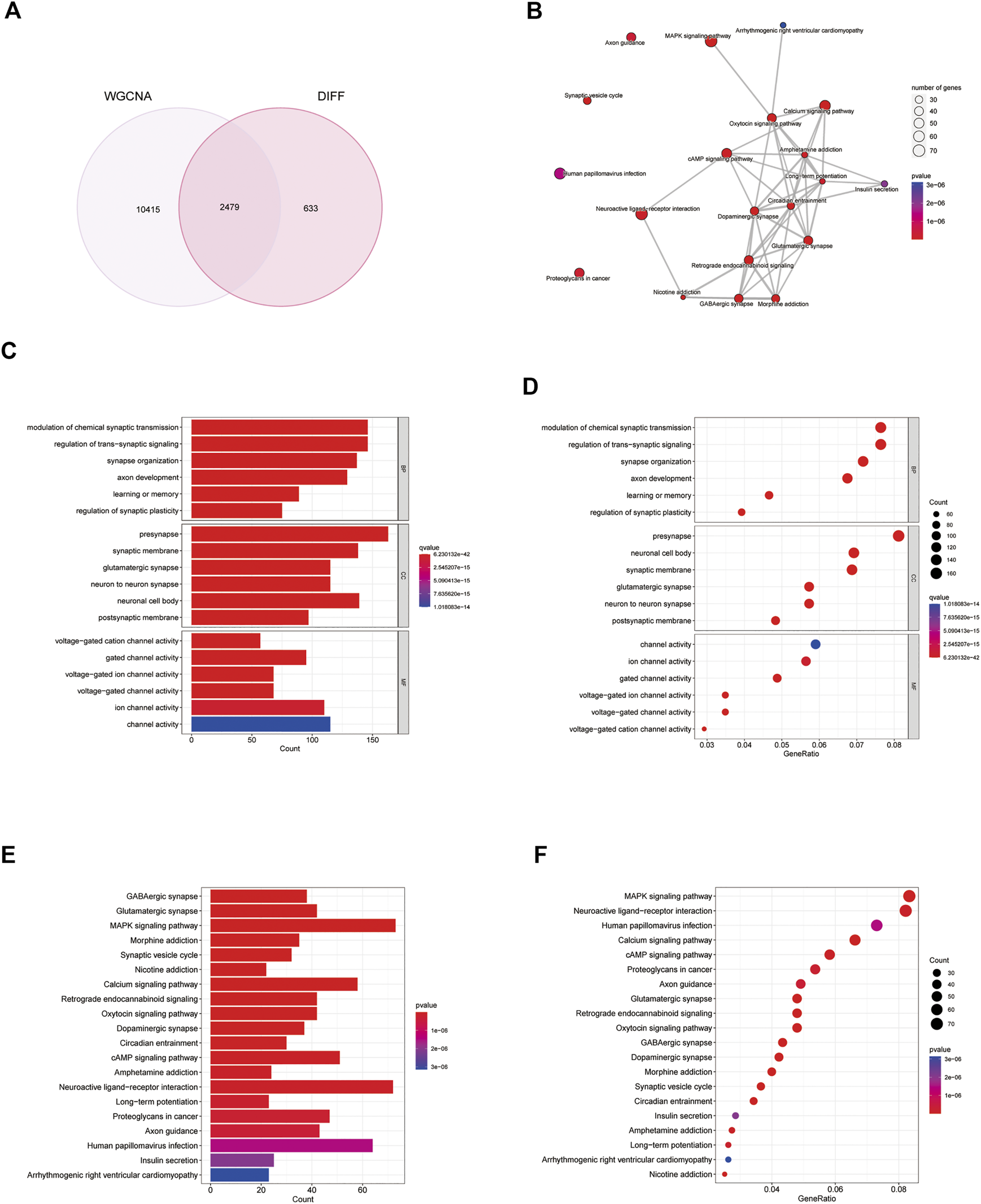 Genes in the turquoise module were compared with differential genes to identify disease-related genes in GO and KEGG analyses (Figure 5A). According to the GO enrichment results, the enriched pathways were mainly involved in modulation of chemical synaptic transmission, regulation of transsynaptic signaling, synapse organization, presynaptic membrane, and glutamatergic synapses. According to KEGG enrichment analysis, the enriched pathways were mainly involved in GABAergic synapses, glutamatergic synapses, MAPK signaling pathways, and morphine addiction (Figures 5B–F).