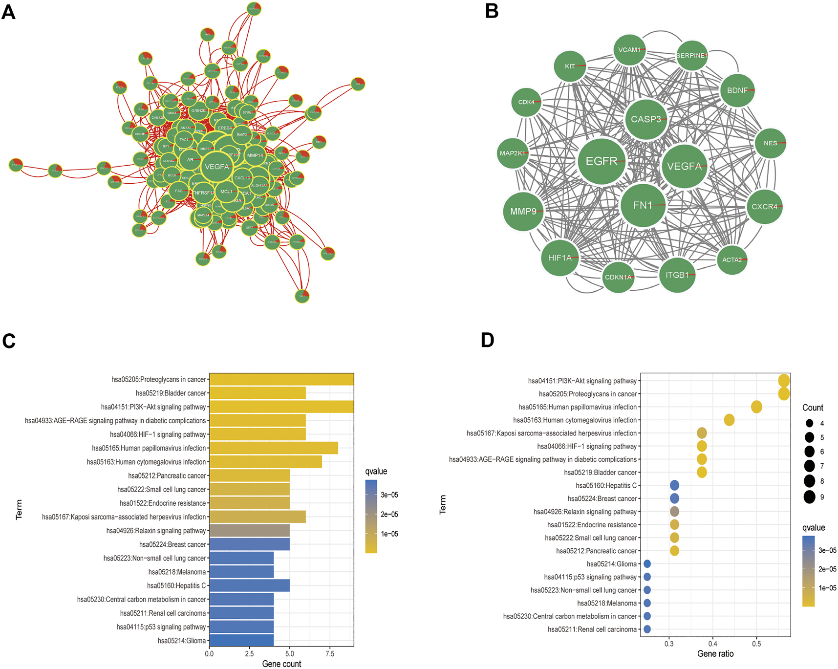 To construct the PPI network, 155 disease-related genes and molecular drug targets were imported into the STRING online database (version 11.0) (Figure 6A). Aberrant proteins were removed, resulting in a 154-protein interaction network. Cytoscape’s plugin code was used to identify 17 essential subpopulation genes (score = 13) (Figure 6B). Key cluster genes were upregulated for proteoglycans in cancer, bladder cancer, PI3K-Akt signaling pathway, AGE-RAGE signaling pathway in diabetic complications, HIF-1 signaling pathway, Kaposi sarcoma-associated herpesvirus infection, endocrine resistance, small cell lung cancer, pancreatic cancer, and human cytomegalovirus infection (Figures 6C,D). In addition to acting on cellular metabolic pathways, paclitaxel may be useful for diagnosing glioblastoma.