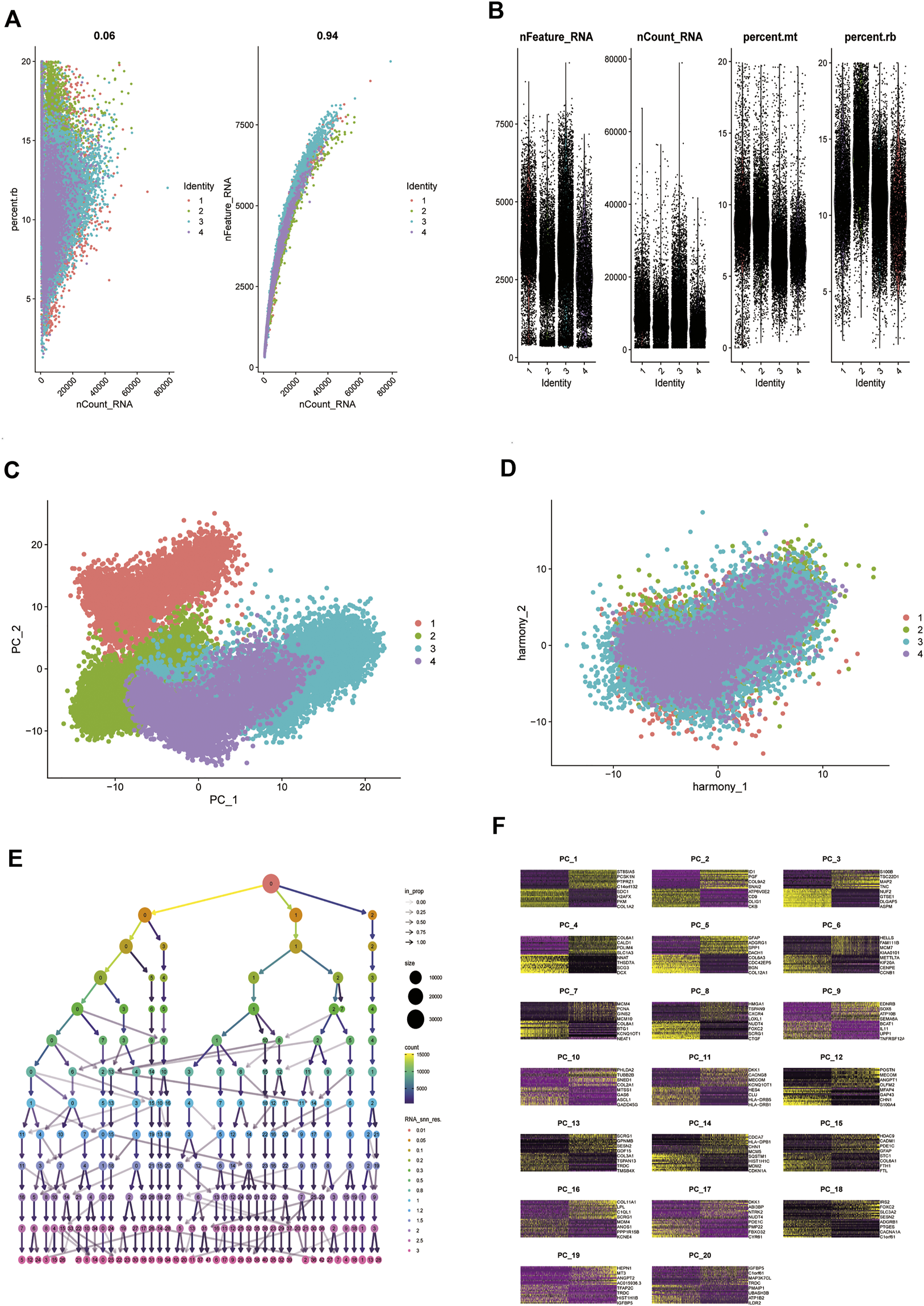 Comparison of single-cell analysis before and after normalization. (A,B) Quality control analysis of single-cell data sets. (C,D) Plots of principal component analysis (PCA) before and after standardization. (E,F) Resolution with principal components (PCs) to be confirmed.