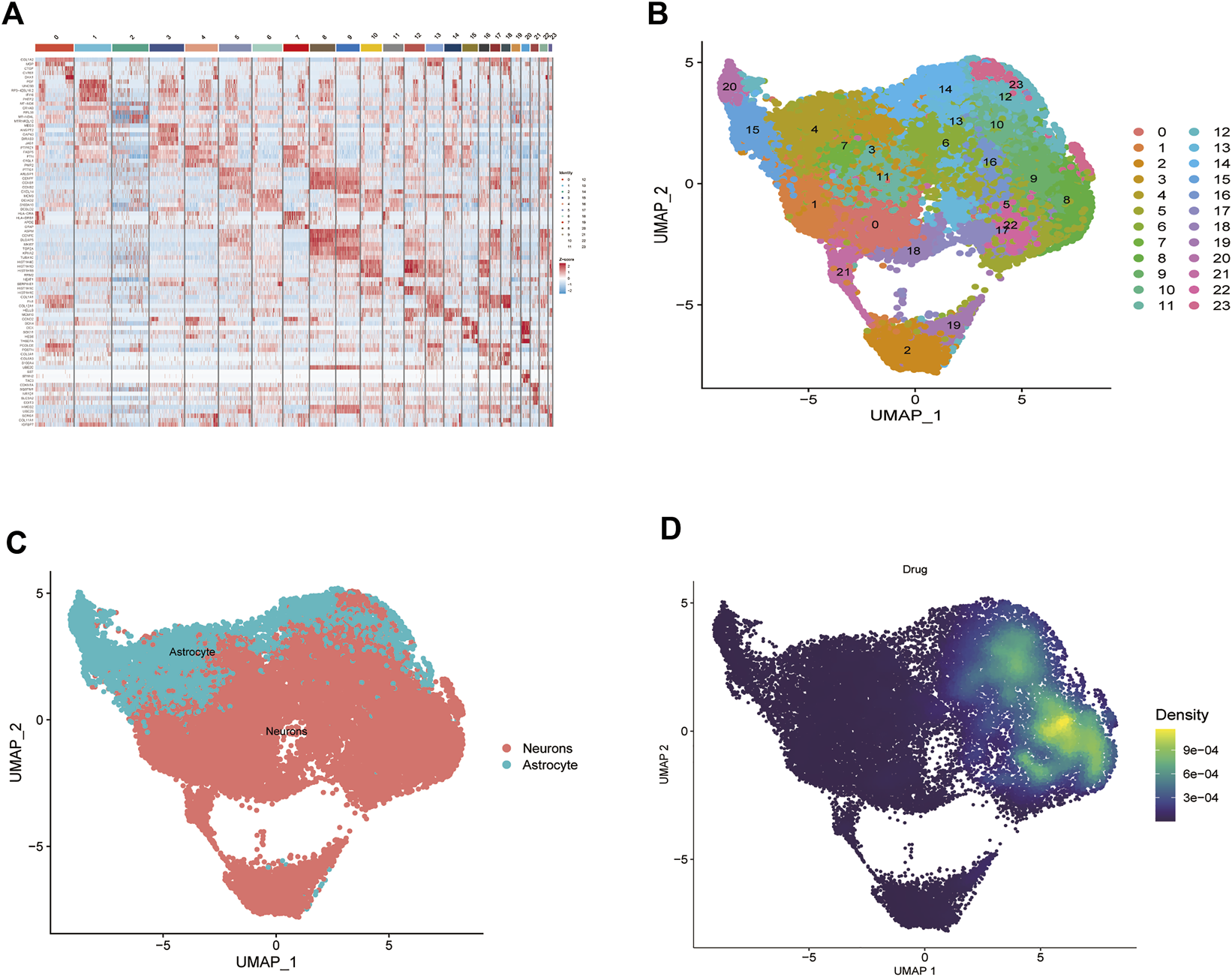 Analysis of biopsy specimens from four patients with active glioblastoma showed a strong positive correlation between the measured gene expression and number of genes detected in the cells, both in normal and diseased tissues. In contrast, gene expression detected in the cells was not correlated with the percentage of mitochondria. Therefore, cells with >2,500 and <200 genes detected per cell and cells with a >5% mitochondrial percentage were filtered out to ensure the quality of the analyzed cells. Quality control and screening of single-cell sequencing of samples from patients with glioblastoma are shown in (Figures 8A,B). Principal component analysis plots were downscaled for cluster analysis (Figures 8C,D); the cluster tree was scaled to a resolution of 1.5 (Figure 8E), and the principal component value was 16 (Figure 8F). The heatmap shows each gene type (Figure 9A). Unified manifold approximation and projection showed 24 cell clusters (Figure 9B), with different categories of cells labeled with different colors. Relevant genes were retrieved using the Cellmaker database and intersected with the gene corresponding to each unified manifold approximation and projection cluster (Figure 9C). The cellular distribution of drug target AUCell functional scores showed that paclitaxel acts mainly on neuronal cells (Figure 9D).