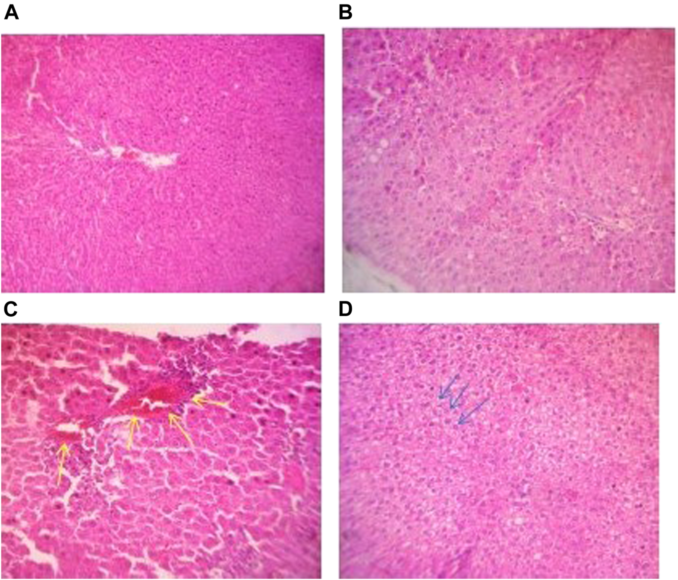 (A) Photomicrograph of liver section of a control rat in subacute toxicity study exhibiting normal hepatocytes and sinusoids (H&E stain, X100). (B) Photomicrograph of liver section of a rat in subacute toxicity of CPL 100% at 100 mg/kg showing no notable abnormality (H&E stain, X100). (C) Photomicrograph of liver section of a rat in subacute toxicity study of CPL 100% at 1000 mg/kg showing piecemeal necrosis showed in yellow arrow (H&E stain, X100). (D) Photomicrograph of liver section of a rat in subacute toxicity study of ACL 100% undergoing hydropic change shown with blue arrows.
