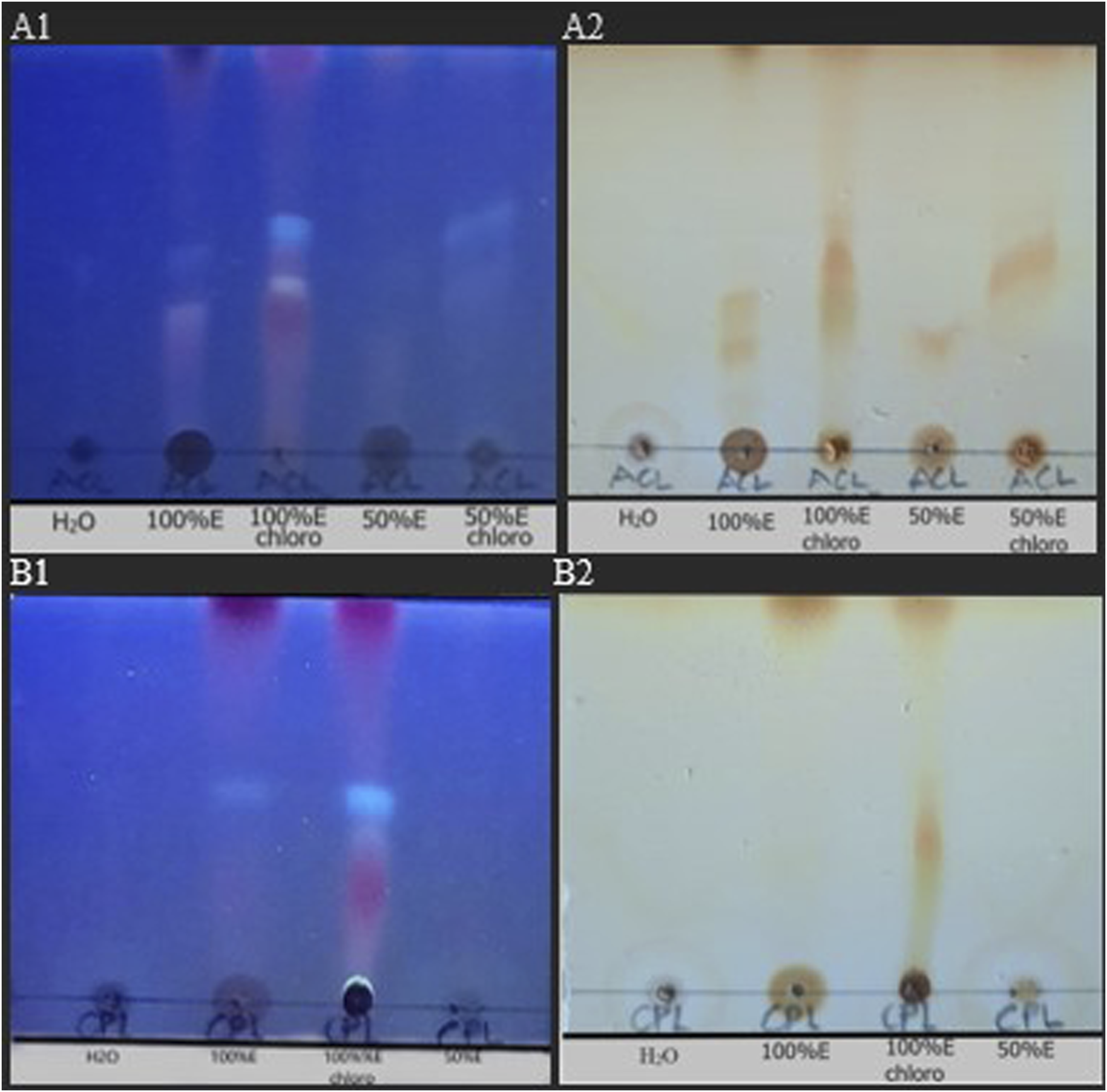 TLC chromatogram of crude extracts and fractions of Alchornea cordifolia leaves (ACL). and Carapa procera leaves (CPL). (A) ACL aqueous extract (ACL H20), ACL 100% ethanol extract (ACL100%E), ACL 100%E Chloroform fraction (ACL100%E chloro), ACL 50%Etoh:50% aqueous extract (ACL 50%E), ACL 50%E Chloroform fraction (ACL 50%E chloro). (B) CPL aqueous extract (CPL H20), CPL 100% ethanol extract (CPL 100%E), CPL 100%E Chloroform fraction (CPL100%E chloro), CPL 50% ethano1:50% aqueous extract (CPL 50%E). Stationary phase: glass-backed precoated silica gel plates (Merck) impregnated by 0.02 M sodium acetate; Mobile phase: PE: CHCI3: MeOH (1:4:0.5) under UV light of 254 nm (A1,B1) and stained with iodine vapour (A2,B2).