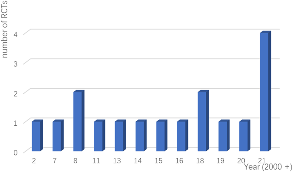 Number of RCTs on CIPN treatment published each year from 2007 to 2021.