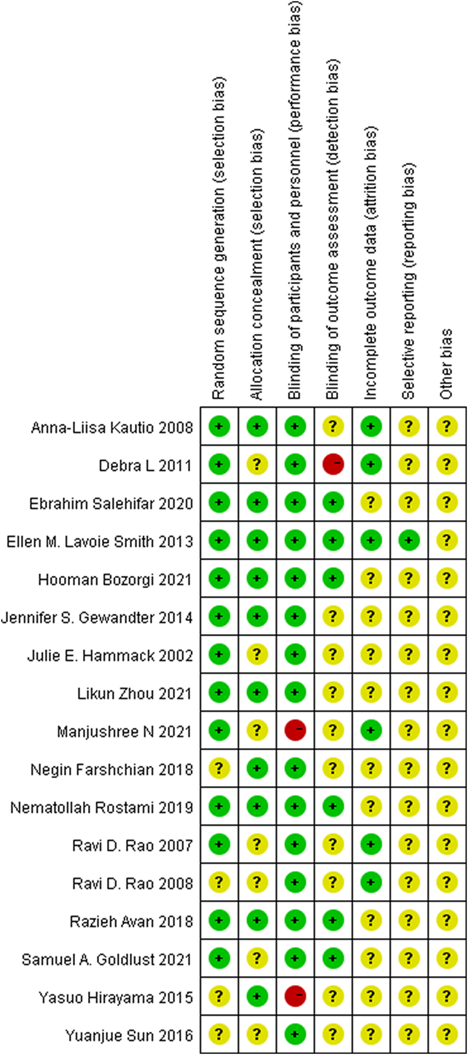 | Key elements of bias risk | RandomACT sequence generation, blinding, allocation concealment, completeness of outcome data, selective reporting, measurement bias, and other bias |