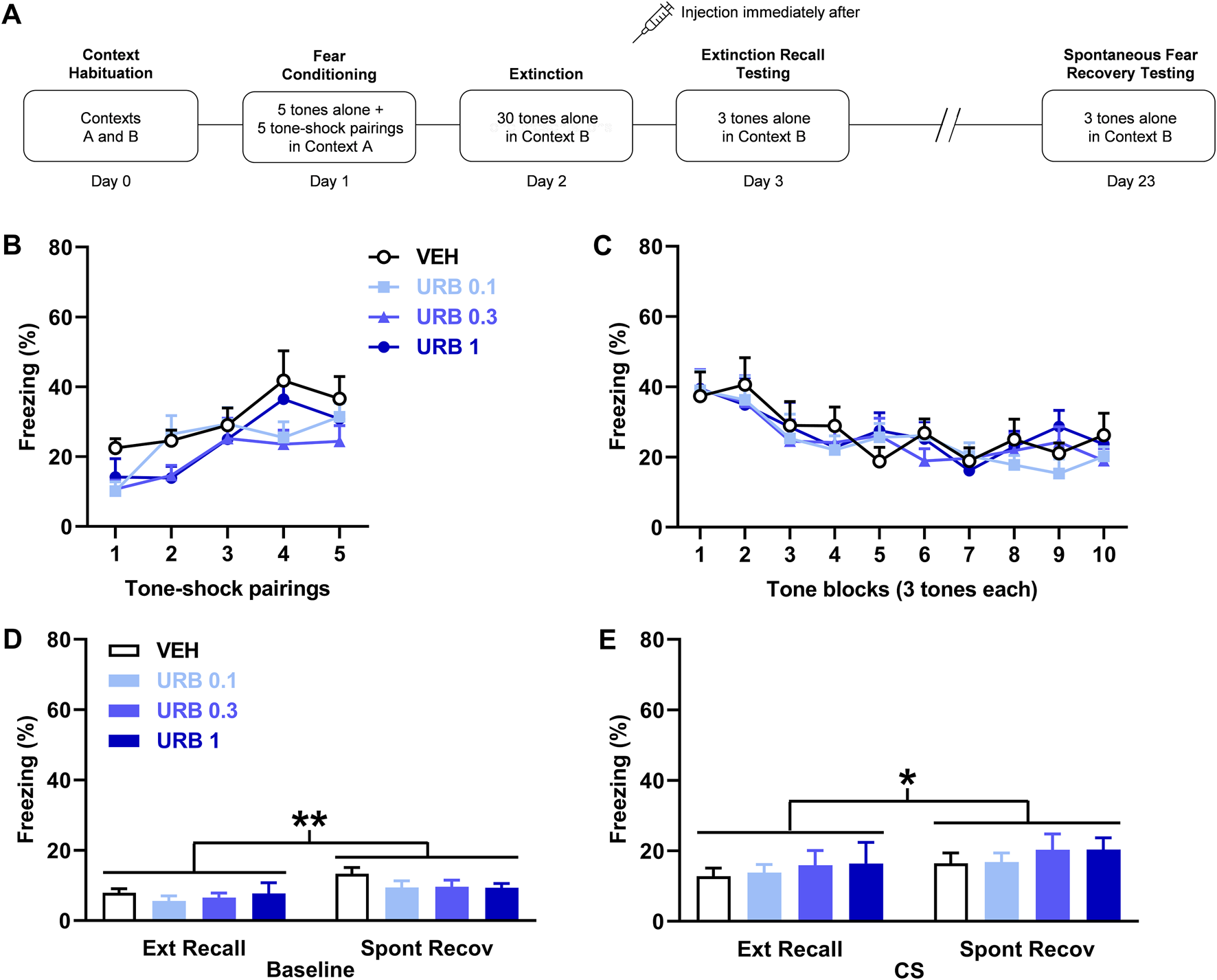 URB597 (URB) given after delayed extinction has no effect on extinction recall or spontaneous fear recovery. (A) Experimental design showing the behavioural testing and drug administration procedures used (n = 12/group). (B,C) There were no differences in freezing in response to tone-shock pairings during fear conditioning (B) or tones during extinction (C) between the groups to receive vehicle (VEH) or the different URB doses (0.1 mg/kg: URB 0.1; 0.3 mg/kg: URB 0.3; 1 mg/kg: URB 1) after delayed extinction. (D) Freezing before tone presentations (Baseline) was increased during spontaneous fear recovery (Spont Recov), compared to extinction recall (Ext Recall), testing (**p < 0.01) but URB had no effect on freezing. (E) Freezing in response to the tones (CS) was increased during Spont Recov, compared to Ext Recall, testing (*p < 0.05) but URB had no effect on freezing.