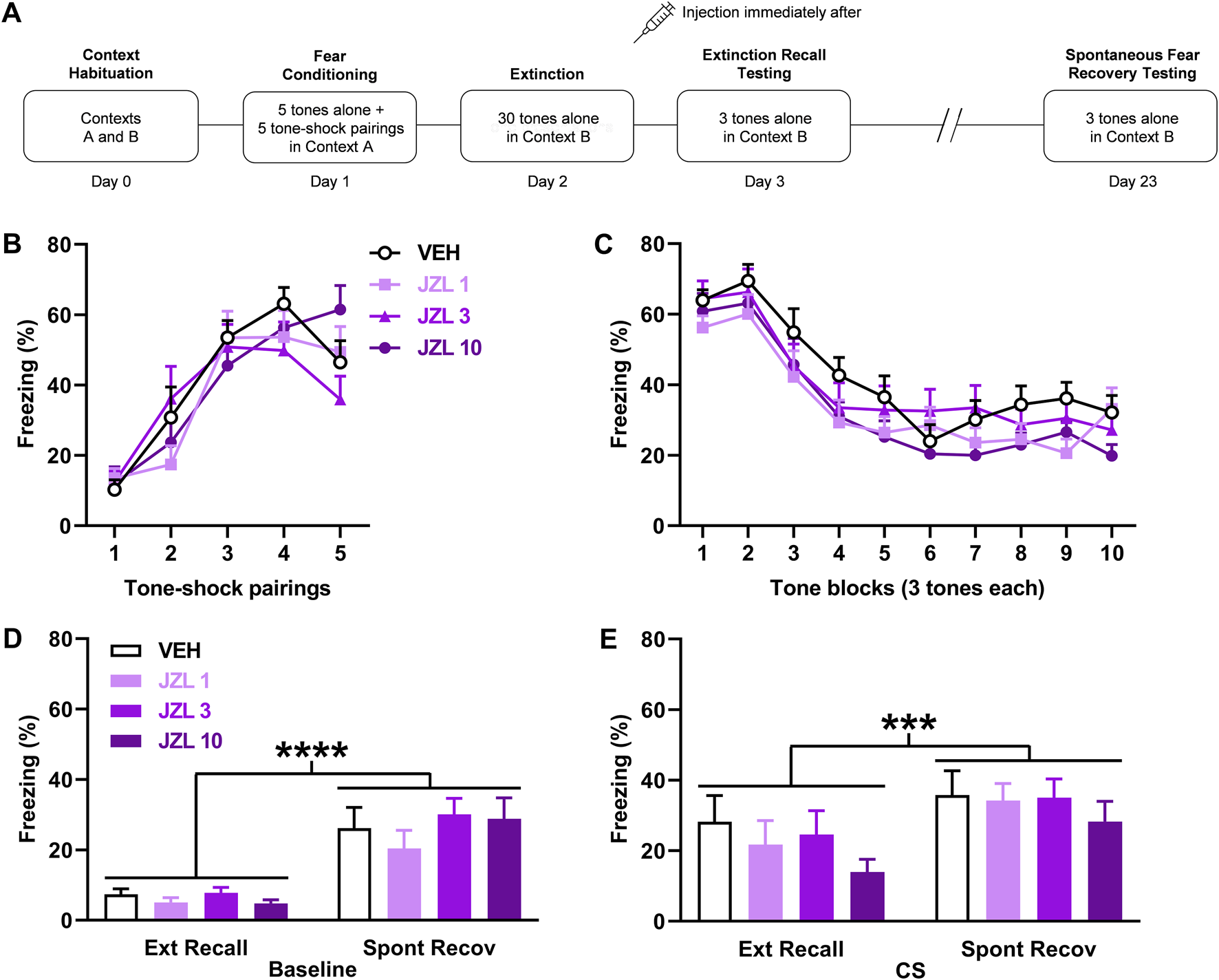 JZL184 (JZL) given after delayed extinction has no effect on extinction recall or spontaneous fear recovery. (A) Experimental design showing the behavioural testing and drug administration procedures used (n = 12/group). (B,C) There were no differences in freezing in response to tone-shock pairings during fear conditioning (B) or tones during extinction (C) between the groups to receive vehicle (VEH) or the different JZL doses (1 mg/kg: JZL 1; 3 mg/kg: JZL 3; 10 mg/kg: JZL 10) after delayed extinction. (D) Freezing before tone presentations (Baseline) was increased during spontaneous fear recovery (Spont Recov), compared to extinction recall (Ext Recall), testing (****p < 0.0001) but JZL had no effect on freezing. (E) Freezing in response to the tones (CS) was increased during Spont Recov, compared to Ext Recall, testing (***p < 0.001) but JZL had no effect on freezing.