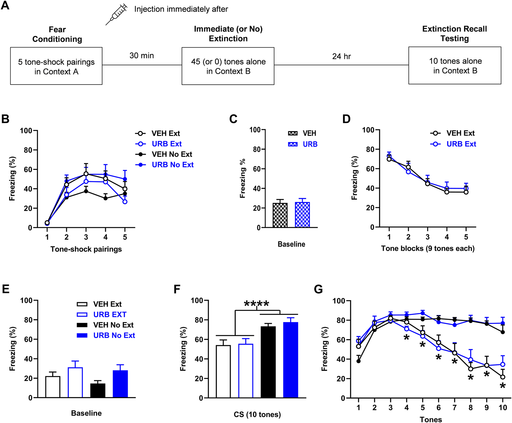 URB597 (URB; 1 mg/kg) given before immediate extinction has no effect on fear expression or extinction. (A) Experimental design showing the behavioural testing and drug administration procedures used (n = 10/group). (B) There were no differences in freezing in response to tone-shock pairings during fear conditioning between the groups to receive vehicle (VEH) or URB before immediate extinction (VEH Ext, URB Ext). However, freezing was increased in the group to receive URB before no extinction (URB No Ext), compared to the group to receive VEH before no extinction (VEH No Ext). (C) There were no differences in freezing before tone presentations (Baseline) during immediate (or no) extinction between VEH and URB. (D) URB had no effect on tone-induced freezing during immediate extinction. (E) Compared to VEH, URB resulted in increased freezing before tone presentations (Baseline) during extinction recall testing (p < 0.05). (F) Tone-induced freezing across extinction recall testing was decreased with Ext, compared to No Ext (****p < 0.0001), but URB resulted in no effect on freezing. (G) Freezing in response to each tone during extinction recall testing was decreased with Ext, compared to No Ext, at tones 4–10 (*p < 0.05) but freezing was unaffected by URB.
