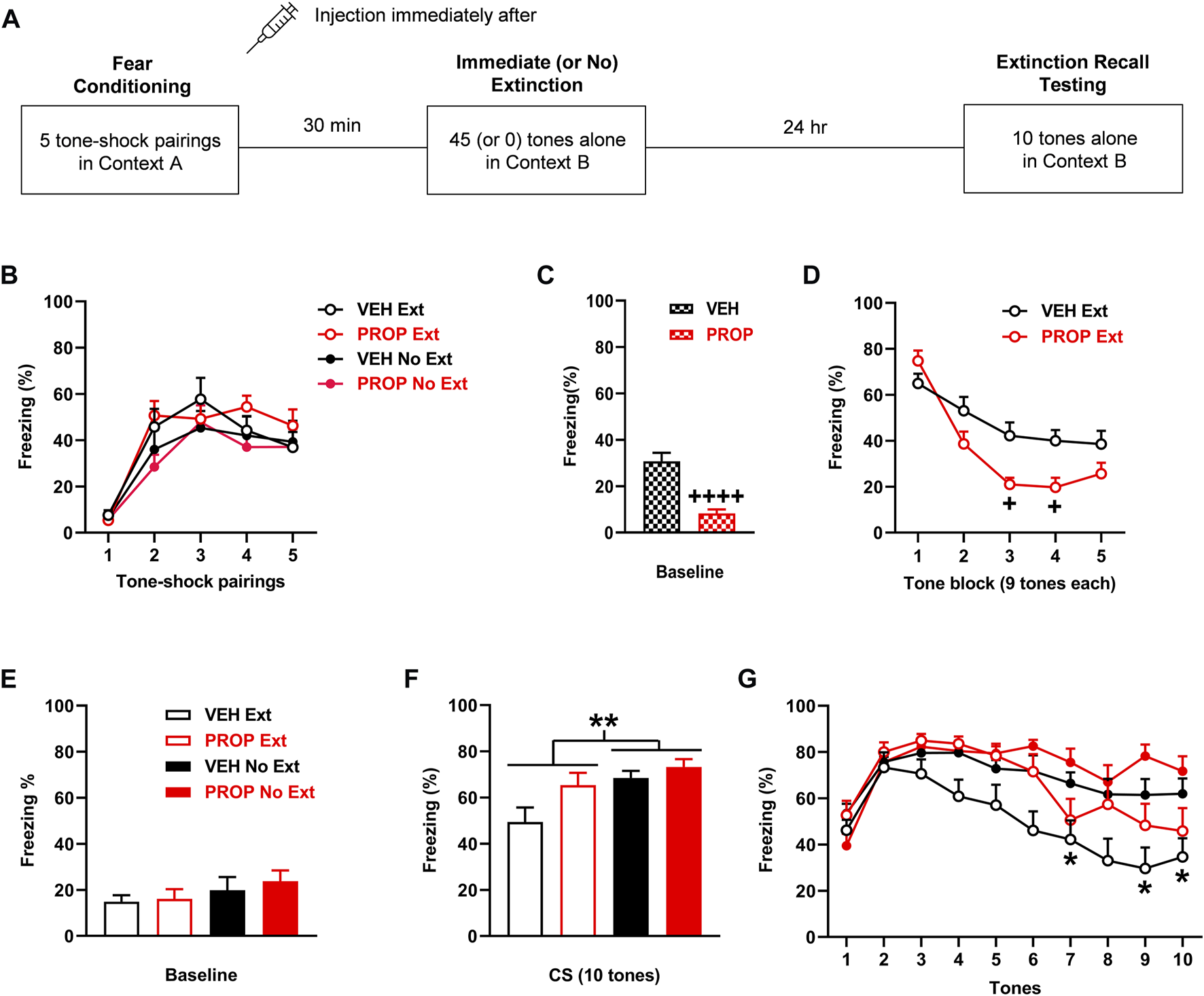Propranolol (PROP; 10 mg/kg) given before immediate extinction reduces fear expression without affecting extinction encoding. (A) Experimental design showing the behavioural testing and drug administration procedures used (n = 10/group). (B) There were no differences in freezing in response to tone-shock pairings during fear conditioning between the groups to receive vehicle (VEH) or PROP before immediate extinction (VEH Ext, PROP Ext) or no extinction (VEH No Ext, PROP No Ext). (C) Compared to VEH, PROP decreased freezing before tone presentations (Baseline) during immediate (or no) extinction (++++p < 0.0001). (D) PROP decreased tone-induced freezing during immediate extinction, compared to VEH (+p < 0.05). (E) PROP resulted in no effect on freezing before tone presentations (Baseline) during extinction recall testing. (F) Tone-induced freezing across extinction recall testing was increased with PROP in comparison to VEH (p < 0.05) and decreased with Ext, compared to No Ext (**p < 0.01). (G) Freezing in response to each tone during extinction recall testing was decreased with Ext, compared to No Ext, at tones 7 and 9–10 (*p < 0.05) but freezing was unaffected by PROP.
