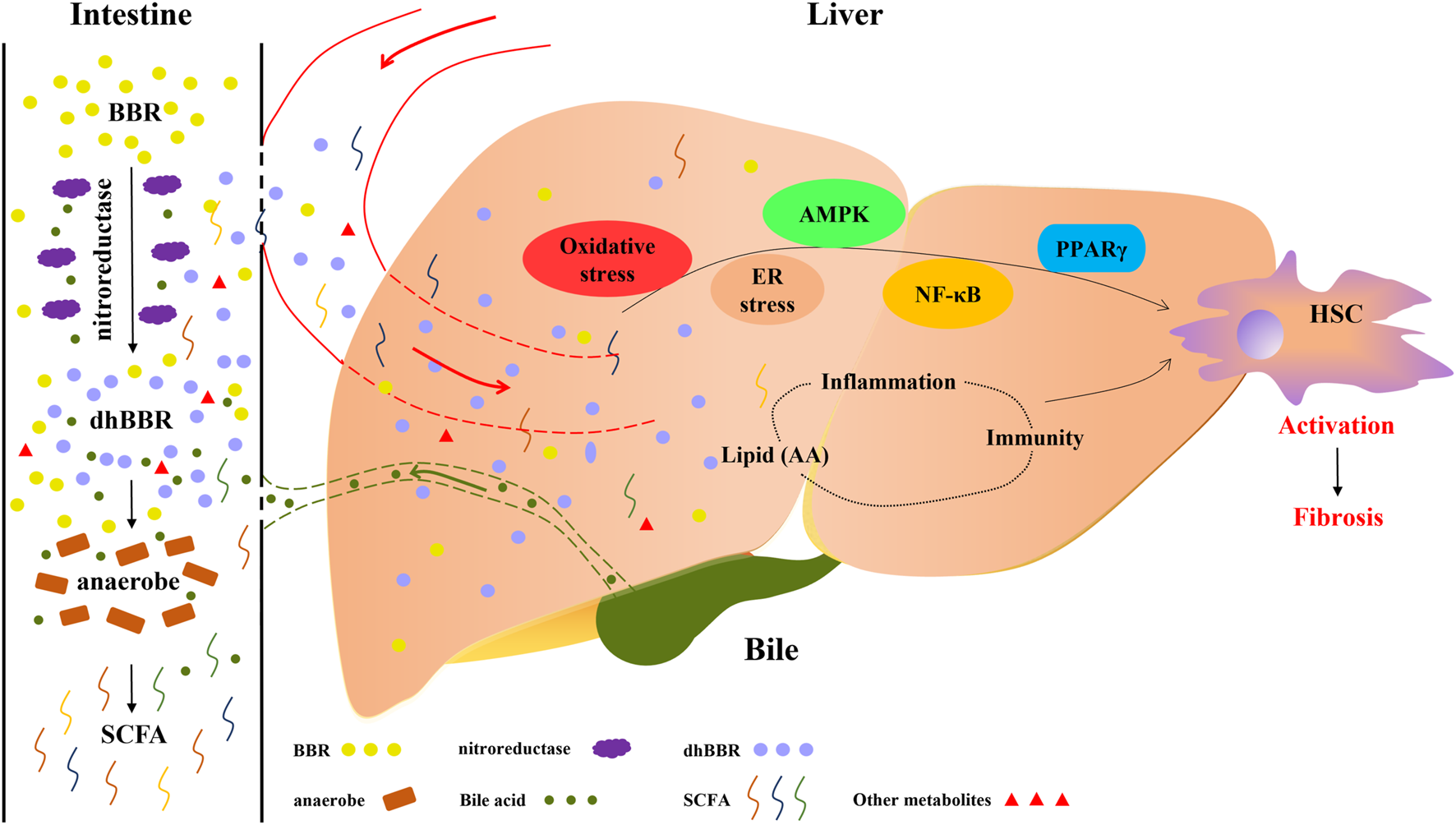 FIGURE 1. Therapeutic effects of berberine (BBR) on liver cirrhosis are associated with lipid metabolism and intestinal flora. BBR is converted to dihydroberberine (dhBBR) and other metabolites by the action of nitroreductase or specific intestinal microorganisms. dhBBR, other metabolites and unmetabolised pro-BBR in turn act on intestinal flora (such as anaerobes) to regulate the microorganism ecosystem and concentrations of intestinal metabolites, such as short-chain fatty acids. Unmetabolised pro-BBR, BBR derivatives and intestinal metabolites enter the liver through the portal vein, and thereafter relieve liver fibrosis by modulating lipid metabolism and regulating hepatic signalling. The potential mechanisms by which BBR reduces fibrosis include the regulation of oxidative stress, ER stress, AMPK, NF-κB and PPARγ signalling and the modulation of immune and inflammatory responses through the production of lipid mediators.