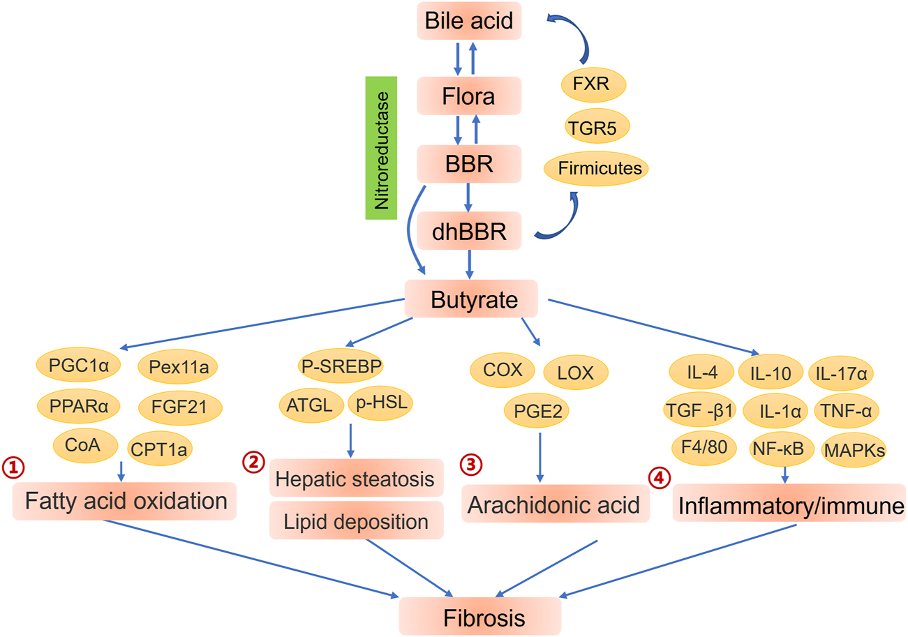 The poor oral bioavailability of BBR is a major hindrance to its clinical application. Fortunately, nitroreductase-containing intestinal flora or specific intestinal microorganisms can transform BBR into dhBBR, OBB, canadine and other derivatives, which are much more soluble and have better efficacy than BBR. These derivatives also have superior anti-inflammatory, anti-oxidant and anti-fibrosis functions, and bile acid metabolism has been shown to increase their formation via crosstalk with intestinal flora. BBR increases the production of butyrate by anaerobic bacteria, and the resulting higher concentrations of butyrate in circulation lead to improvements in host metabolism, decreases in inflammation, enhanced immunity and decreased liver fibrosis. The mechanism by which BBR promotes the metabolites of intestinal flora to further improve liver fibrosis by regulating the liver microenvironment remains largely elusive.