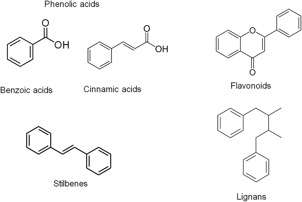 FIGURE 1. Chemical structures of the different classes of phenolic compounds including phenolic acids, flavonoids, stilbenes and lignans. Phenolic compounds are classified into different groups on the basis of the number of phenolic rings they contain and of the structural elements binding the rings to one another. They are generally divided into four classes including phenolic acids, flavonoids, stilbenes and lignans. Phenolic acids are further classified as hydroxyl benzoic and hydroxyl cinnamic acid derivatives (Johnsson, 2004; Nishiumi et al., 2011).