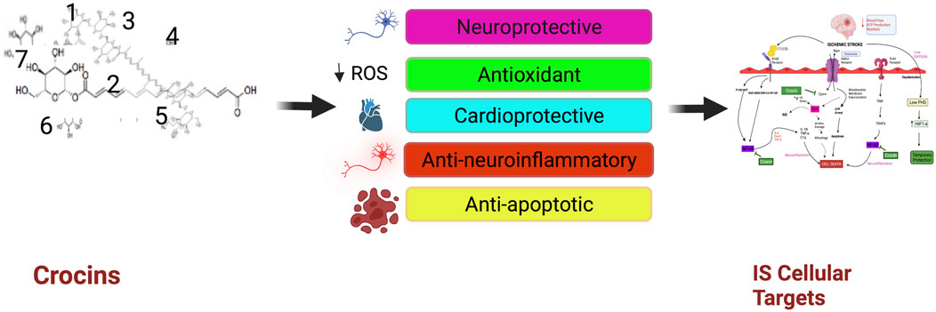 FIGURE 1. Schematic diagram of the mechanistic actions of crocin on the molecular pathways involved in IS.