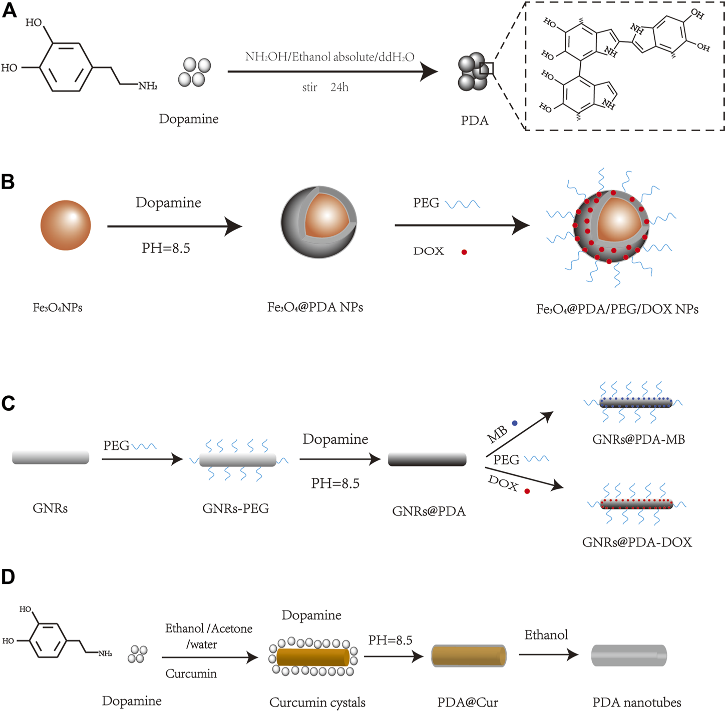 Schematic diagram of PDA nanomaterial synthesis, such as (A) PDA NPs (Liu et al., 2013), (B) Fe3O4@PDA/PEG/DOX NPs (Xue et al., 2017), (C) GNRs@PDA (Wang S. et al., 2016), and (D) PDA nanotubes (Xue et al., 2016).