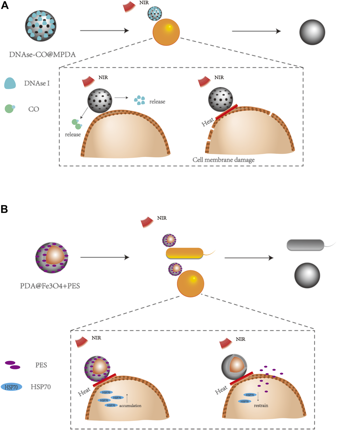 Different ways to enhance the antibacterial effect of the PDA nanosystem. (A) DNAse I can be used to destroy cell membrane densification for enhanced antibacterial effects, taking the thermosensitive CO gas releasing donor (FeCO)-encapsulated MPDA NPs with covalently fixed deoxyribonuclease I (DNase-CO @MPDA NPs) as an example (Yuan et al., 2021). (B) Inhibition of heat shock protein accumulation to enhance antibacterial effects, taking the PDA-encapsulated Fe3O4 and 2-phenylethyl sulfonamide (PDA@Fe3O4+PES) as an example (Liu et al., 2016).
