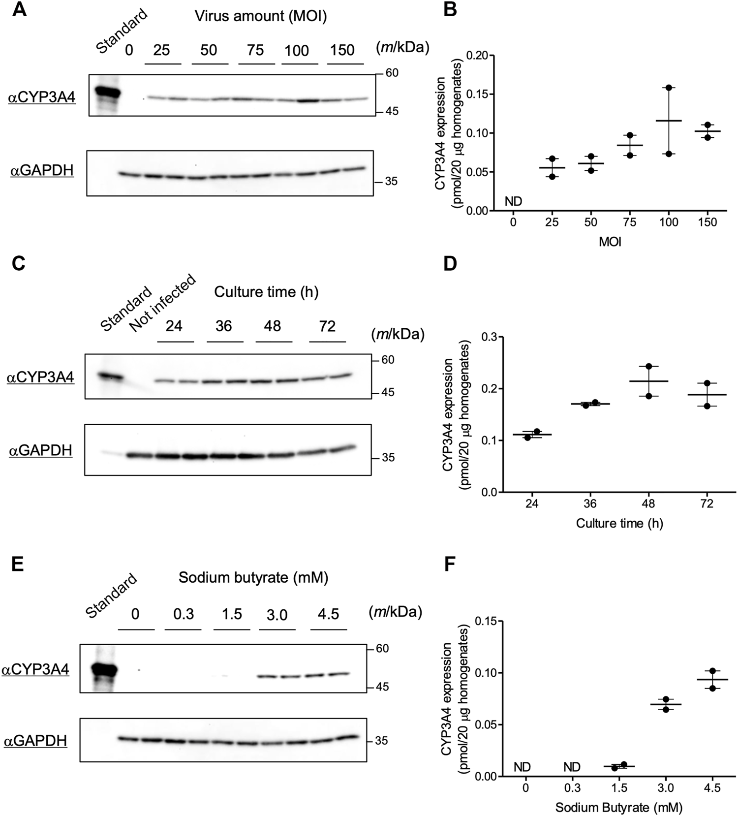 FIGURE 2. Optimization of infection conditions for the Bac-Mam virus. Conditions for the Bac-Mam virus to infect COS-1 cells were optimized by monitoring CYP3A4 expression. CYP3A4 expression in COS-1 homogenates (20 μg) was determined by immunoblotting with Supersomes™ contained 1 pmol CYP3A4 (BD Gentest) as a standard. Viral infection was independently conducted twice in each experiment. (A) Optimization of viral amount (MOI) ranging from 0 to 150. Culture time after infection and concentration of sodium butyrate were fixed at 24 h and 3 mM, respectively. (B) The result of quantification of CYP3A4 in the optimization of viral amount. Each determined CYP3A4 level (N = 2), and the mean ± S.E.M. are presented. (C) Optimization of culture time after infection ranging from 24 to 72 h. Viral amount and concentration of sodium butyrate were fixed at MOI = 100 and 3 mM, respectively. (D) The result of quantification of CYP3A4 in the optimization of culture time. Each determined CYP3A4 level (N = 2), and the mean ± S.E.M. are presented. (E) Optimization of the concentration of sodium butyrate ranging from 0 to 4.5 mM. Viral amount and culture time after infection were fixed at MOI = 100 and 48 h, respectively. (F) The result of quantification of CYP3A4 in the optimization of concentration of sodium butyrate. Each determined CYP3A4 level (N = 2), and the mean ± S.E.M. are presented. ND, not detected.