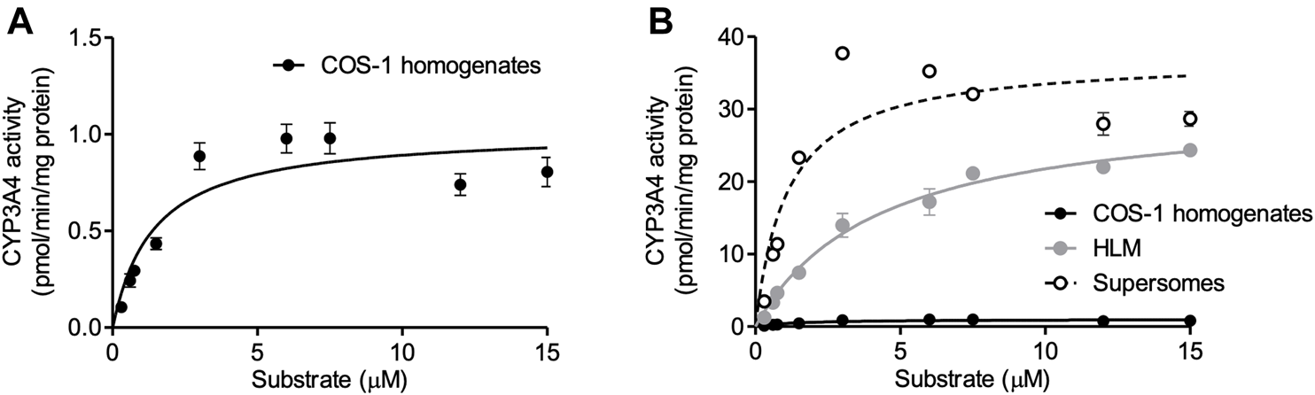 FIGURE 3. Kinetic analysis of expressed CYP3A4 with the Bac-Mam system. Kinetic analysis of CYP3A4 was conducted with luciferin-IPA (Promega) as a substrate. (A) COS-1 homogenates (20 μg) were used as enzyme source, and the data were fitted to the Michaelis-Menten equation. Results are shown as the mean ± S.E.M. of three independent transductions. (B) Comparison of CYP3A4 activity between prepared COS-1 homogenates and HLM/Supersomes™. The result of kinetics with HLM/Supersomes™ (20 μg) as enzyme source were merged. In the result of HLM and Supersomes™, each plot represents the mean ± S.E.M. of triplicate assays. Calculated parameters were listed and compared in the Table.