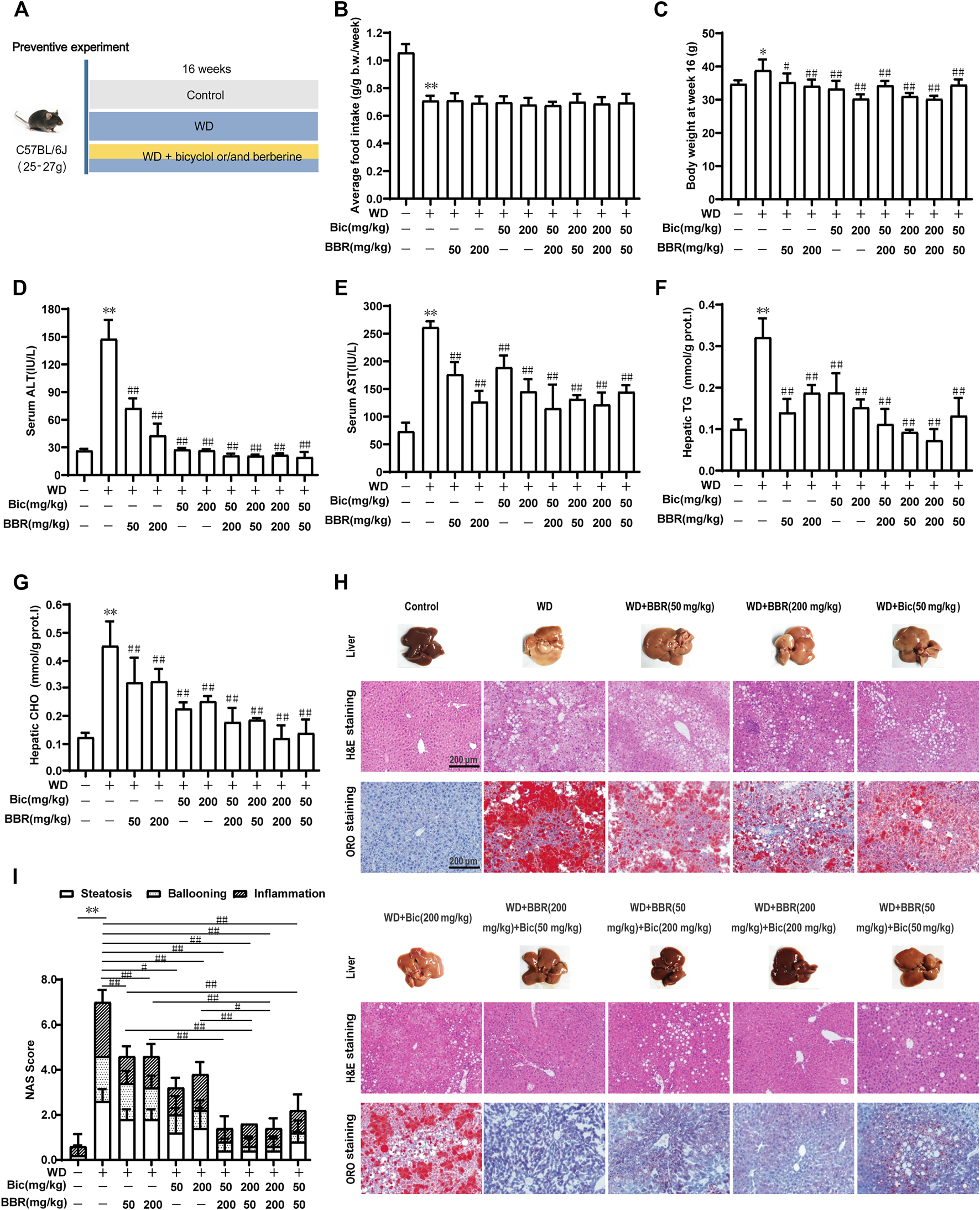 FIGURE 1. Combination of bicyclol (Bic) and berberine (BBR) exerts better preventive effects in mice with NAFL induced by Western diet. Male C57BL/6J mice were treated by free feeding with Western diet (WD) or WD mingled with bicyclol or/and berberine (A). The average food intake during the whole experiment (B) and body weight at week 16 (C) were recorded. At week 16, ALT (D) and AST (E) in serum were detected, and TG (F) and CHO (G) in the liver were measured. Liver histopathology was evaluated using H&E and ORO staining (H) and quantified with NAS score criteria (I). Results were presented as mean ± SD. n = 5 for each group, *p < 0.05 and **p < 0.01, WD-induced model group vs. the control group; #p < 0.05 and ##p < 0.01 vs. the WD-induced model group or monotherapy group.