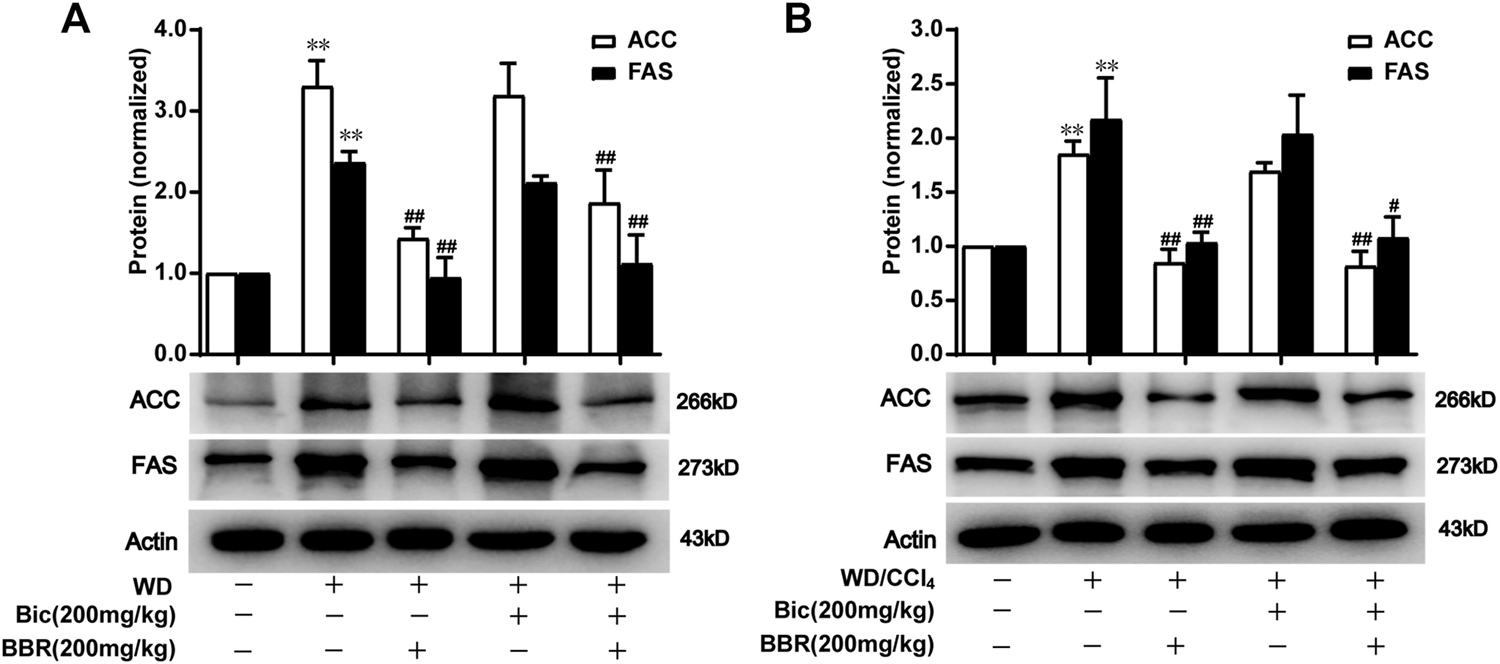 FIGURE 4. Berberine with or without bicyclol suppresses de novo lipogenesis by inhibiting the protein expression of ACC and FAS. Male C57BL/6J mice were freely fed with WD or WD plus bicyclol and/or berberine for 16 weeks (A), or induced with WD/CCl4 for 4 weeks and then treated with drugs for 8 weeks (B). The protein expressions of ACC and FAS were detected and quantified. Results were presented as mean ± SD, and a representative band was shown. n = 5–9 for each group, *p < 0.05 and **p < 0.01, the model group vs. control group; #p < 0.05 and ##p < 0.01 vs. the model group. ACC, acetyl-CoA carboxylase; FAS, fatty acid synthase.