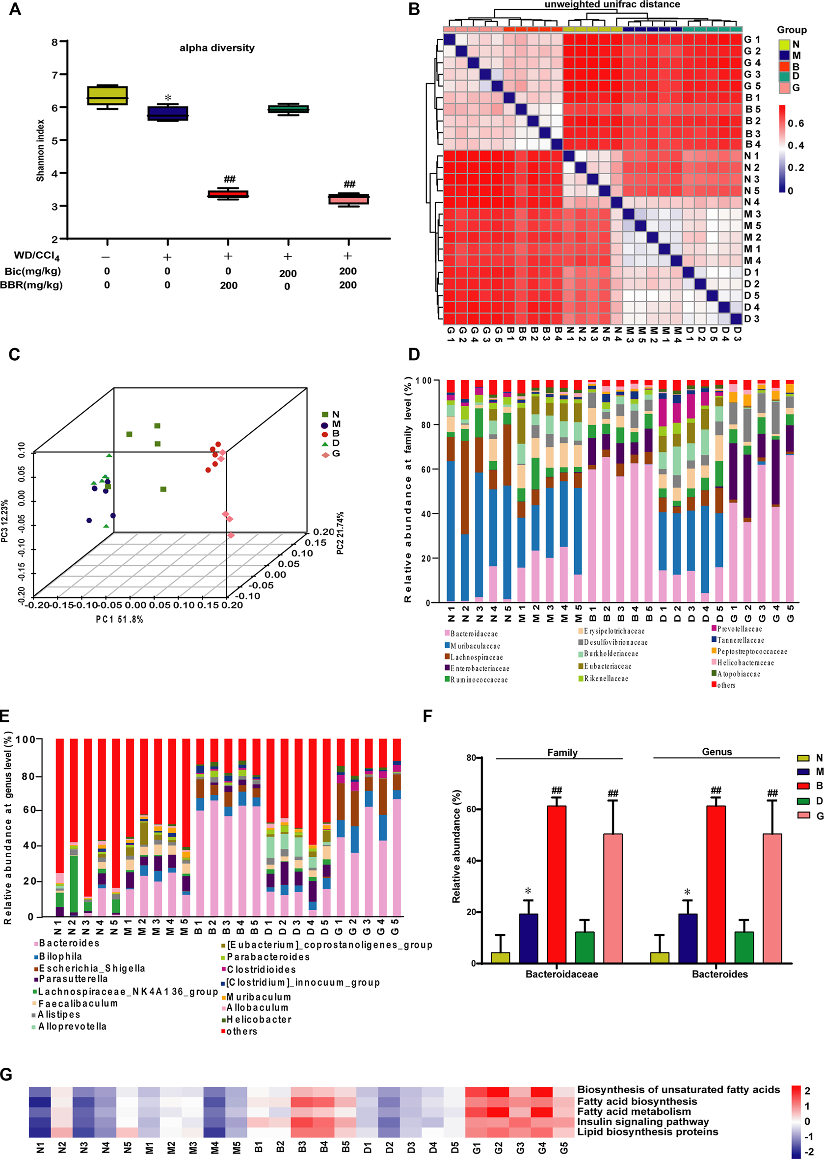 FIGURE 5. Berberine but not bicyclol modulates the composition of gut microbiota in WD/CCl4-induced NASH mice. A total of 25 male C57BL/6J mice fecal samples with five in each representative group were collected and analyzed using 16S rRNA gene sequencing. (A) The alpha diversity of each group was obtained using the Shannon index. (B–C) The beta diversity among samples was obtained using the unweighted UniFrac diversity distance (B) and PCoA (C) of gut microbiota. (D–E) The relative abundance of bacteria at family (D) and genus (E) level. (F) Representative histogram of the most abundant gut microbiota at the family and genus level. (G) Prediction of lipid metabolism-related microbiome function based on KEGG database. *p < 0.05, **p < 0.01 vs. the control group; #p < 0.05, ##p < 0.01 vs. the WD/CCl4 group. N, Control; M, WD/CCl4; B, WD/CCl4+BBR(200 mg/kg); D, WD/CCl4+Bic(200 mg/kg); G, WD/CCl4+BBR(200 mg/kg)+Bic(200 mg/kg).