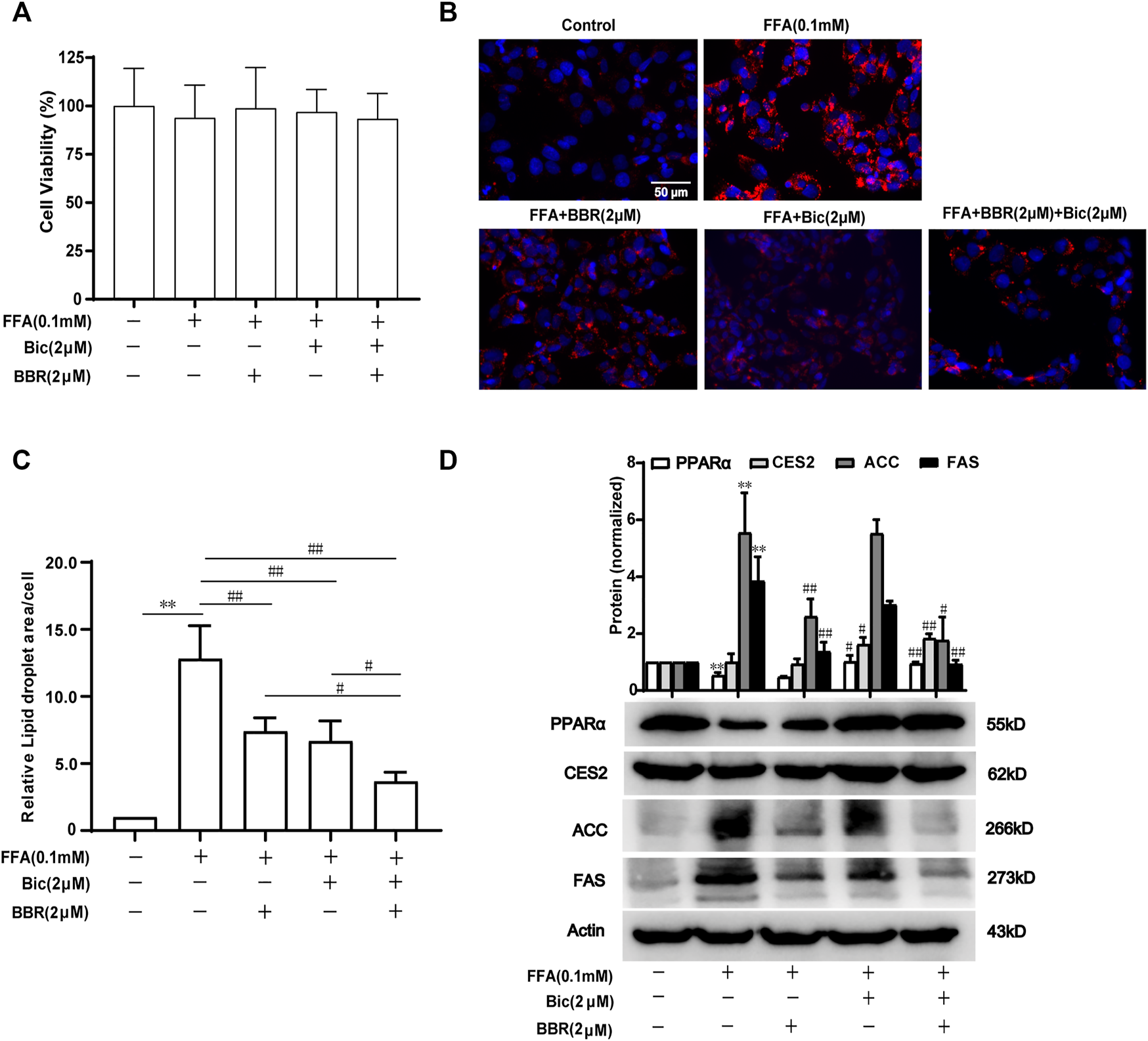 To further verify the superior lipid-lowering effects and the mechanisms of action after combination of bicyclol and berberine, we established an FFA-induced lipid accumulation model in HepG2 cells. The MTT assay showed that 0.1 mM FFA and 2 μM bicyclol and/or berberine treatment had no obvious cytotoxicity on HepG2 cells (Figure 6A). Highly accumulated lipid droplets (LDs) in hepatocytes were observed by Nile Red staining after FFA induction, while the contents of LDs were dramatically reversed by berberine or bicyclol treatment, with more significant effects than their respective monotherapy after combination (Figure 6B). The effects were validated by the quantification of LDs (Figure 6C). The protein levels of PPARα and CES2 were slightly decreased by FFA induced-treatment but reversed by bicyclol with or without berberine (Figure 6D). In contrast, the protein expressions of ACC and FAS induced by FFA were decreased by berberine with or without bicyclol (Figure 6D). The results are consistent with the findings in mice models (Figures 3, 4), suggesting that the combined use of bicyclol and berberine preferably alleviates lipid accumulation via upregulating PPARα and CES2 expressions by bicyclol and downregulating ACC and FAS expressions by berberine.