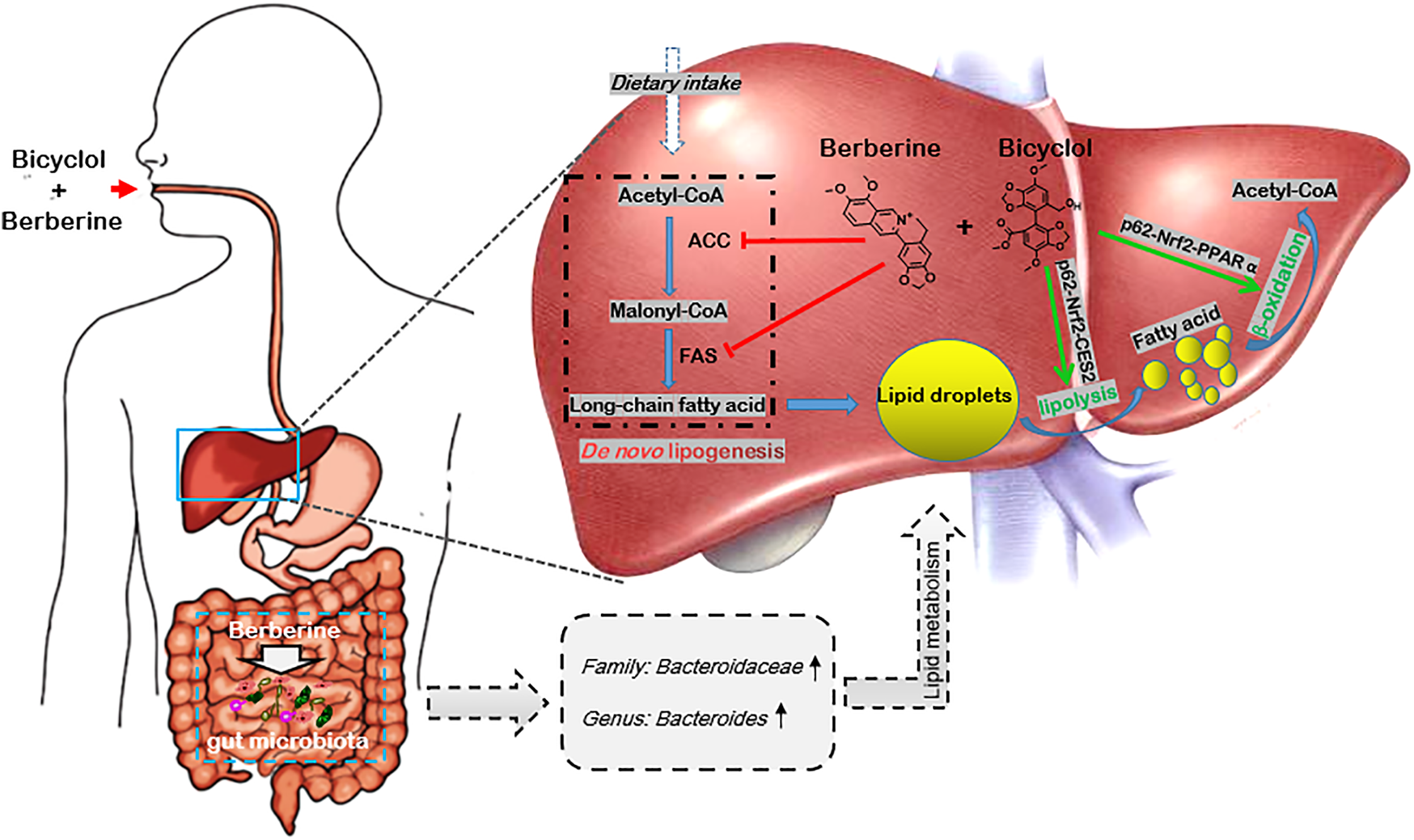 In summary, we first proposed a new available strategy of combined use of bicyclol and berberine to treat NAFLD. The better overall effect on NAFLD is related to the enhancement of lipolysis and β-oxidation by bicyclol via restoring the p62-Nrf2-CES2/PPARα signaling axis and suppression of lipogenesis by berberine via downregulating ACC and FAS, along with the enrichment of lipid metabolism-related Bacteroidaceae (family) and Bacteroides (genus) by berberine. Notably, the combined use of bicyclol and berberine does not influence the pharmacological roles of each other but enhances the amelioration effect for NAFLD, which predicts it to be a new available strategy to treat NAFLD.
