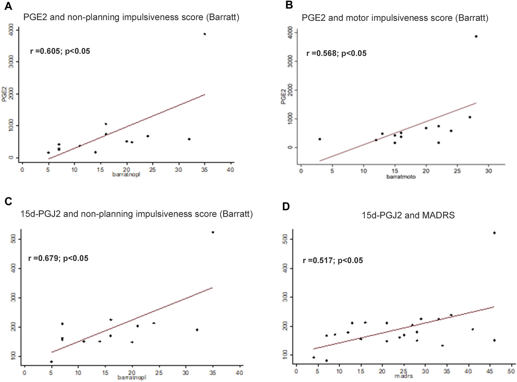 Assessment of correlations among biological parameters and psychological tests. Plasma levels of the inflammatory prostaglandin PGE2 were correlated with non-planning impulsiveness score (A), and with motor impulsiveness score (r = 0.568; p < 0.05) (B). Levels of the anti-inflammatory 15d-PGJ2 correlated with Barratt questionnaire non-planning impulsiveness score (C) and Montgomery-Asberg Depression Rating Scale (MADRS) score (r = 0.517; p < 0.05) (D). Correlations were assessed by using Pearson correlation coefficient. The significance was considered p < 0.05.