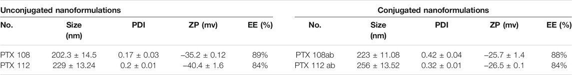 PTX 108 and PTX 112 were selected for conjugation of the antibody on the basis of particle size, polydispersity index, surface charge, zeta potential, and encapsulation efficiency. The physicochemical properties of the developed nanoformulations before and after antibody conjugation were determined.