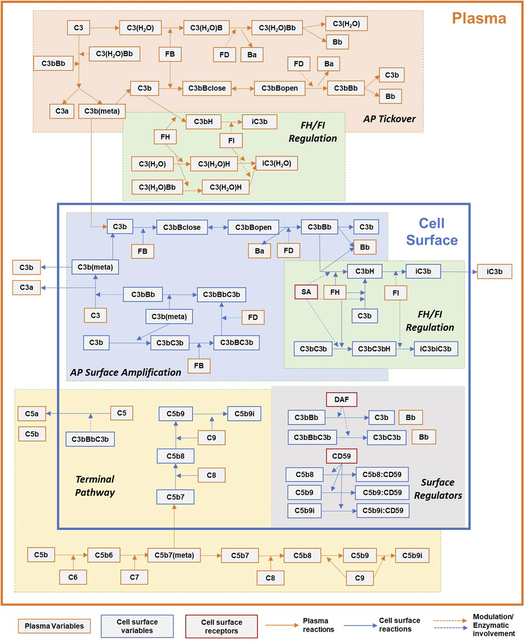 Simplified overview of the processes in the complement pathway model for plasma and cell surface reactions. Key processes shown here: alternative pathway (AP) tickover, regulation by FH and FI in plasma and cell surface, AP surface amplification, terminal pathway, and surface regulators: sialic acid, DAF, and CD59. Dynamics for binding of complement proteins to Properdin are not included here for simplicity and represented separately in Figure 2. Other key processes included in the model but not shown here: dynamics of regulation by CR1, clusterin, and vitronectin.