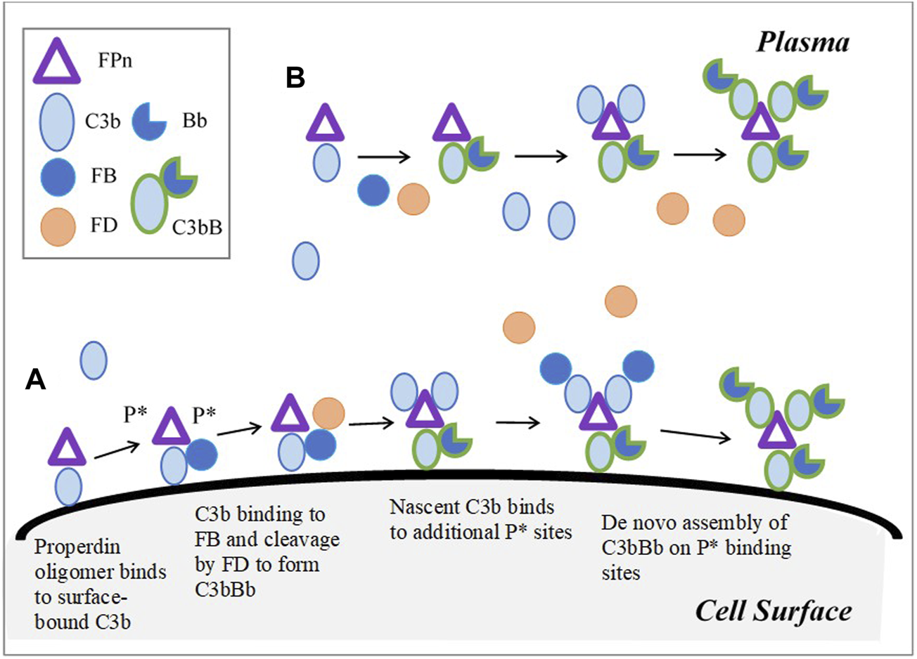 Model implementation for Properdin dynamics in plasma and cell surface (expanded based on Figure 6 in Hourcade (2006)). (A) Cell surface: Properdin binds to surface bound C3b and C3-proconvertases, C- convertase, or iC3b, and provides two additional sites P* for the de novo assembly of the convertase. FPn binding to only surface-bound C3b is shown in the figure for simplicity. Similarly, in addition to C3b-P* binding, C3 proconvertase–C3bB, C3b-convertase, and iC3b can occupy P* sites. (B) Plasma: C3b or its complexes and cleavage products bind to three binding sites on FPn, leading to convertase assembly. Unlike on cell surface, P* does not contribute to amplification of the pathway through additional binding sites in plasma; however, complement activation in plasma is enhanced by Properdin due to increased binding between C3bP and FB, and stabilization of C3-convertase.
