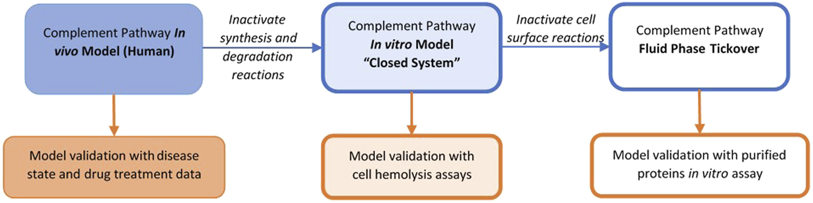 The overall validation of the model dynamics has also been performed against data for disease pathologies and drug treatments for completeness. Thus, varied representations of the same complement pathway model, for example, fluid-phase model, closed system, or human in vivo system, supported model validation across several data types with parameter values kept the same across all the representations.