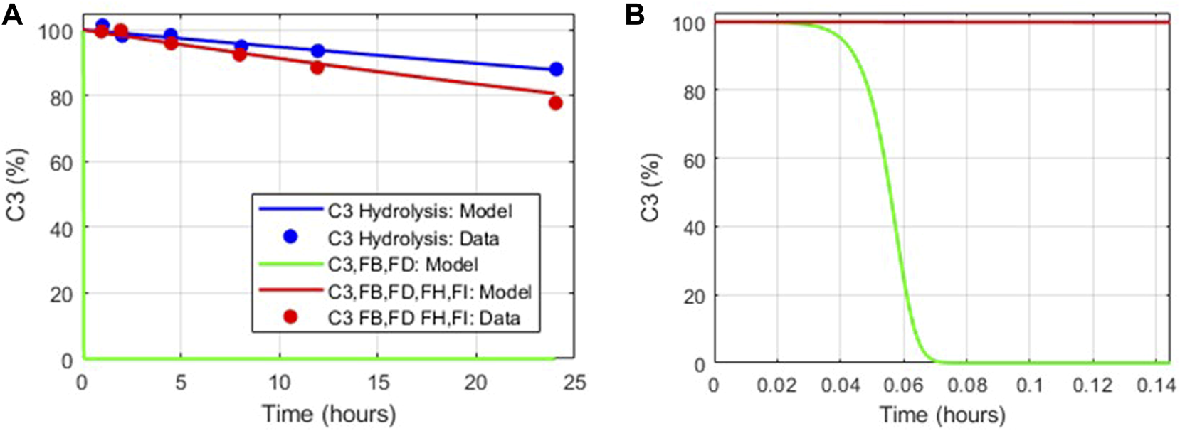 The dynamics of tickover reactions in the complement model was assessed based on the literature data (Pangburn et al., 1981) for the decay of C3 hemolytic activity due to spontaneous hydrolysis alone, with purified proteins FB and FD, and with FB, FD, FH, and FI. Aligned with the literature data, the hemolytic activity of C3 due to spontaneous hydrolysis was predicted to decline at a slow rate (Figure 4A), and in the presence of FB and FD, all C3 hemolytic activity was lost within minutes (Figure 4B). However, the regulatory activity of FH and FI in addition to FB and FD led to the controlled decay of C3 hemolytic activity, but it was faster than that due to hydrolysis alone. The value of the parameter for only the forward binding rate of C3b to FB was adjusted within the literature reported values (1.74–4.74 L/(micromole*minute)) to match the experimental data.